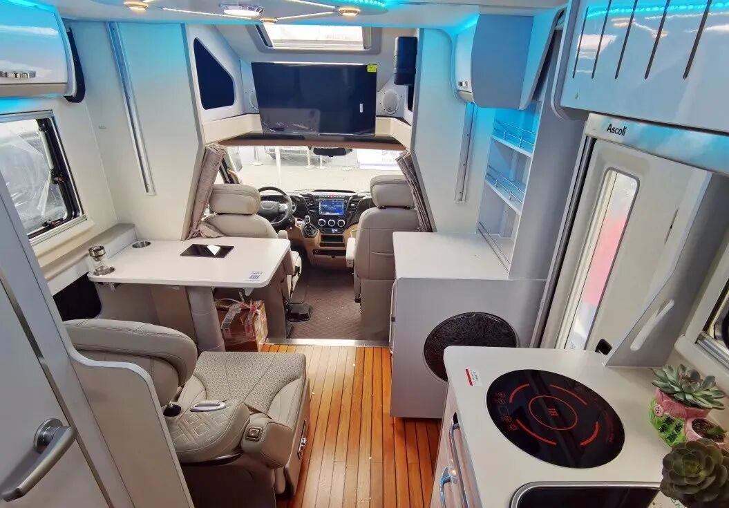 驾驶区与后方贯通式设计日常使用更加的方便,驻车时可从驾驶区直接进入车身内部;内部各功能区都有规划,会客区、休息区、厨房区、卫浴区等功能区一应俱全;此外,由于采用小额头的造型设计,2021款大白鲨房车取消了车头处的额头床,并在额头处的位置配置了32寸小米液晶电视、储物格、顶制天窗、富声房车专用音箱系统等多样设施,日常休闲娱乐体验更加舒适;