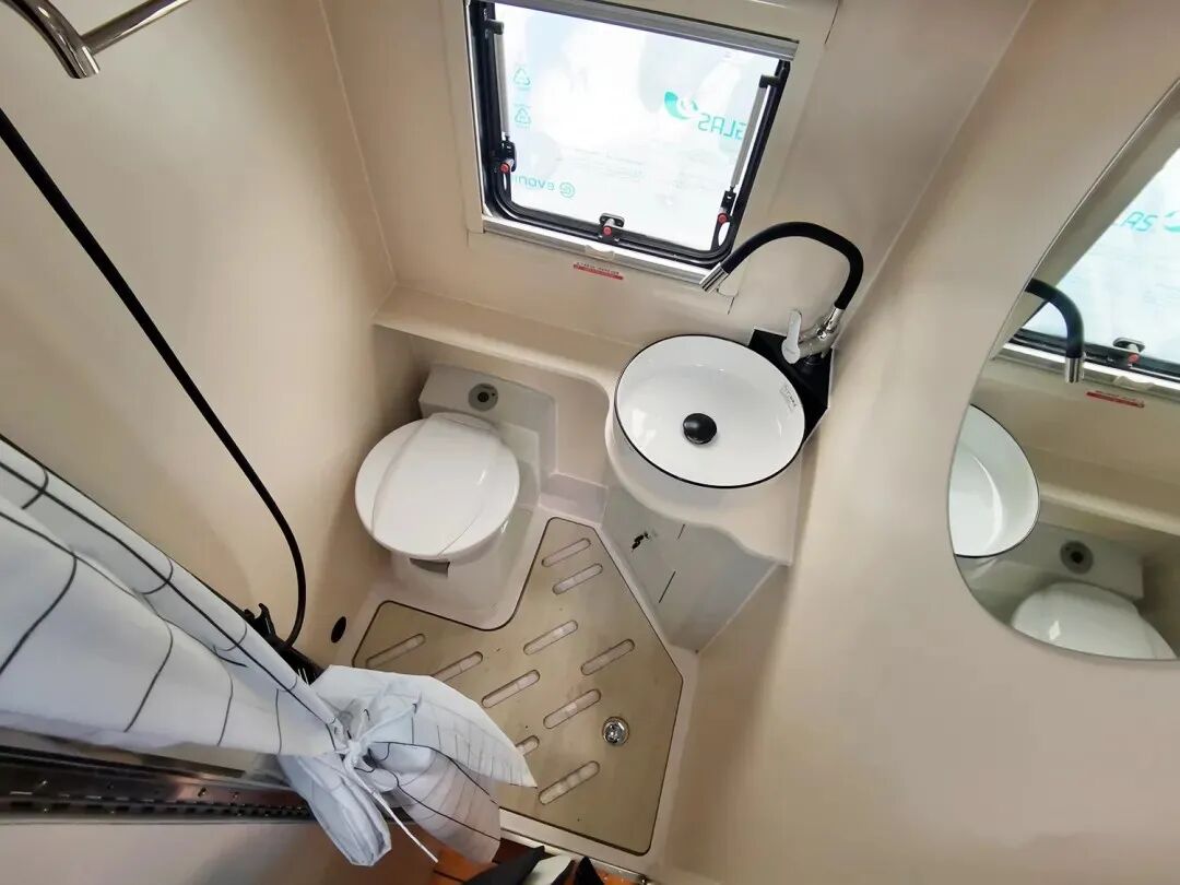 卫浴区采用封闭式设计,地面还做了干湿分离;内部配置了多美达车载马桶、毛巾架、浴镜、浴帘、独立淋浴花洒、一体式洗漱池等多种设施,充分满足日常洗漱需求;