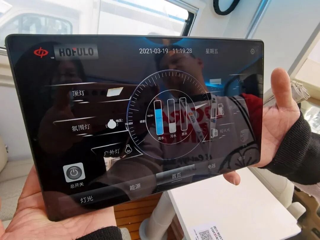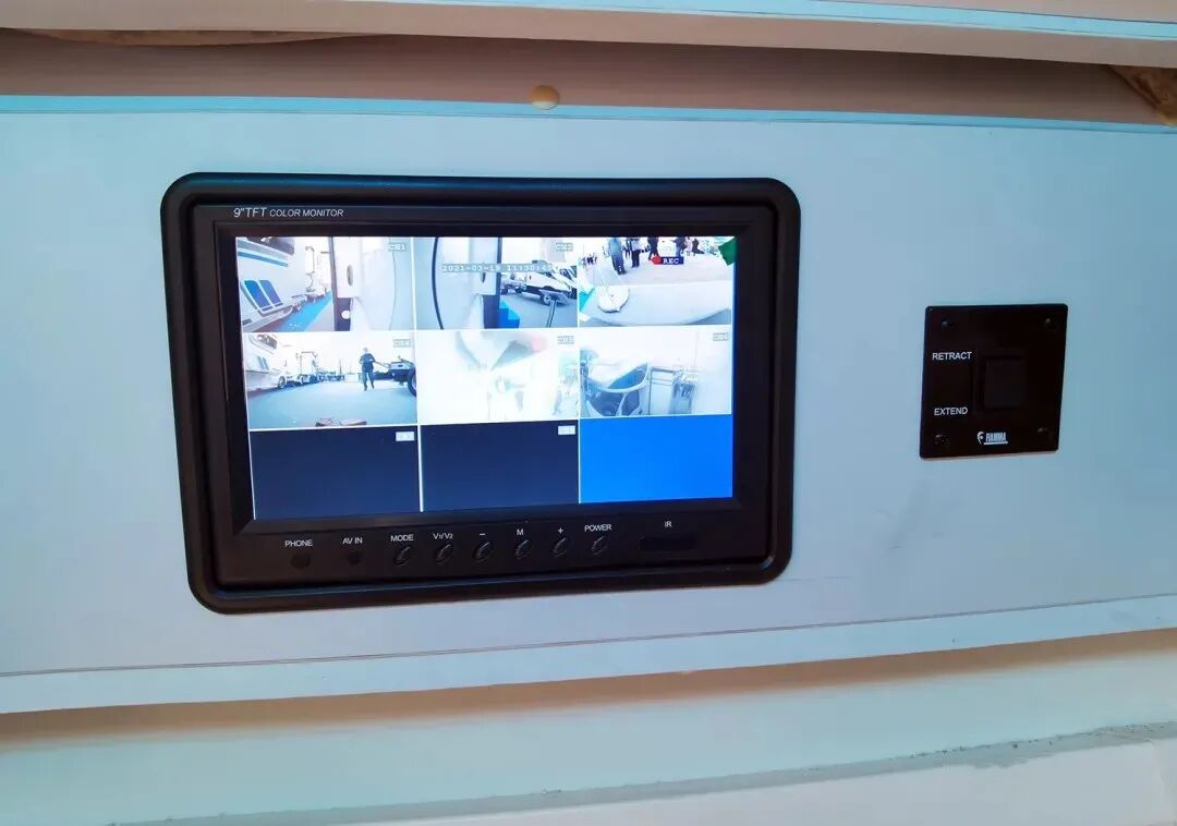 主门上方配置了8路实时监控系统显示屏可用于实时查看车身四周状况,显示屏右侧是菲亚玛电动遮阳棚的开关;中控面板位于主门右上方的位置,同时搭配装有控制系统的平板电脑,智能化升级,日常操作起来更加的简单方便;