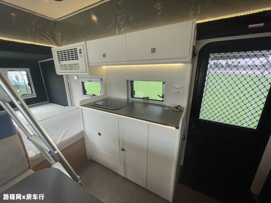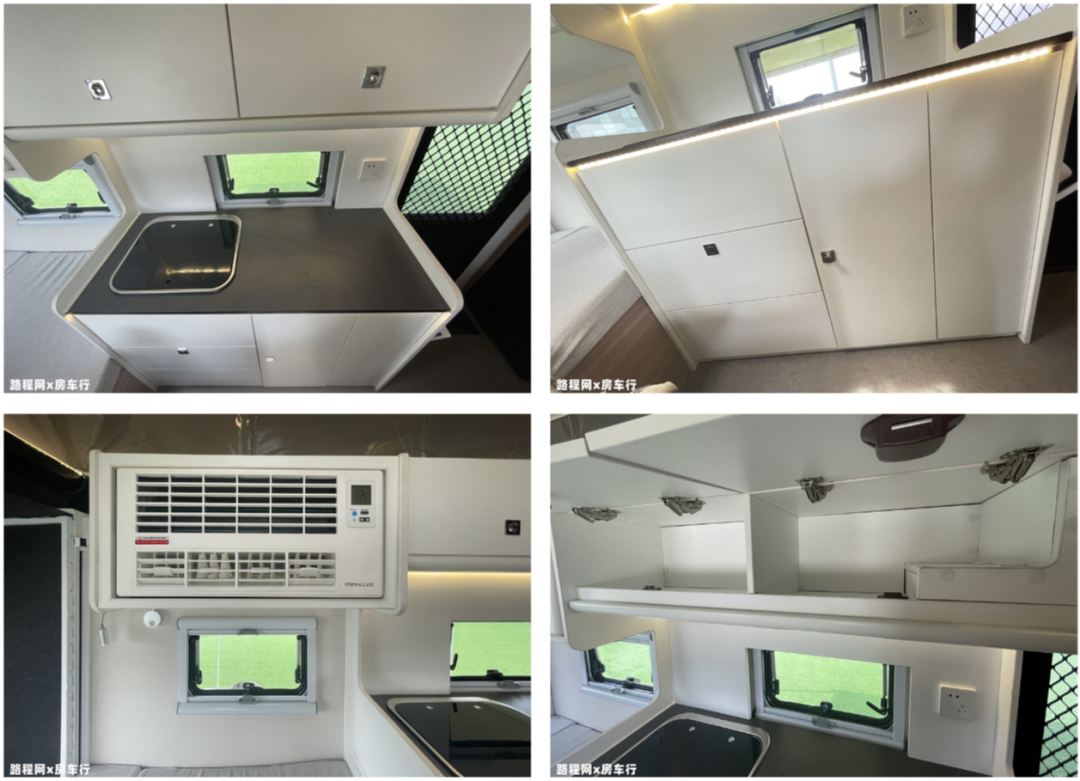 车内的厨房区位于左侧的位置,设有大面积的操作台、盖板式洗菜池、储物柜、吊柜、抽屉等设施,与户外厨房搭配,使用起来还是很方便的;而在储物吊柜旁边设有上汽大通壁挂式48V直流变频空调;