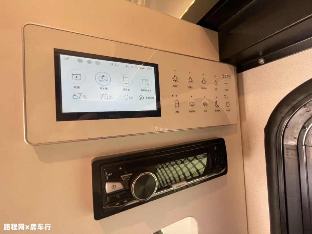 上方则是生活舱集控屏所在,4.3英寸智能集控屏,可查看并控制车上逆变器、市电接入管理、电池电量、清水箱水量、灰水箱水量、娱乐、加热、冰箱等,夏日出行记得先打开空调哦~同时集控屏带有故障检测、异常状态提醒等功能,方便及时发现并避免隐患,让旅行生活更加舒心!