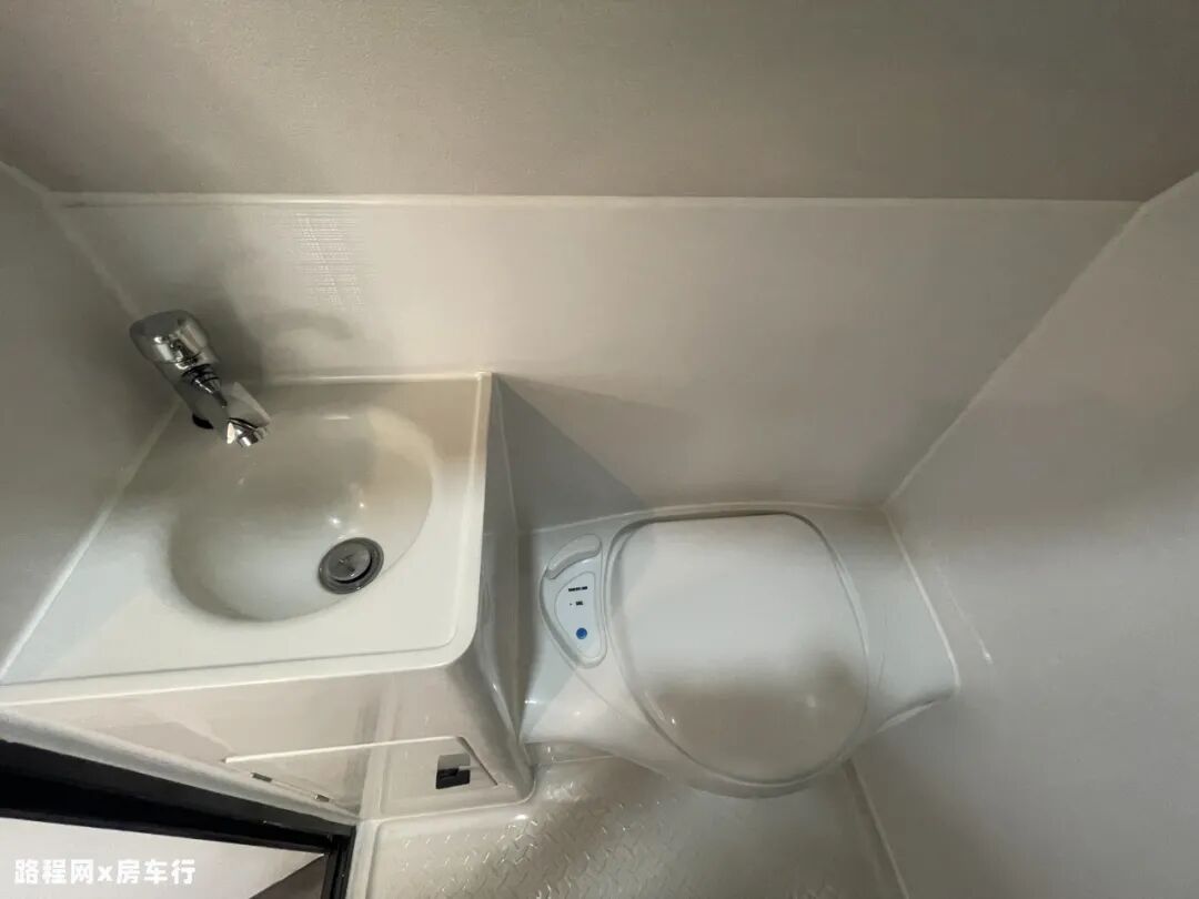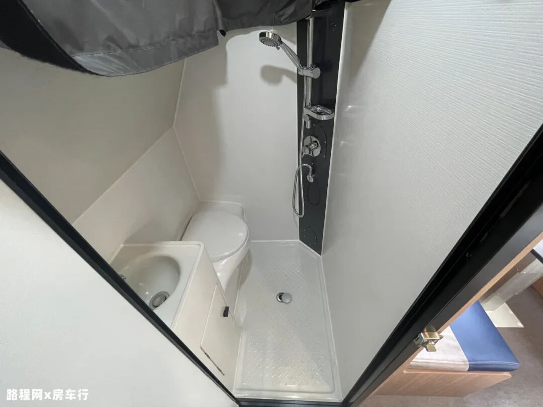 独立卫浴间采用干湿一体式设计,内部空间充足,足够一名成年人使用;卫浴设施方面配有赛特福德盒式马桶、洗漱池、储物柜、独立淋浴花洒、浴帘、特鲁玛燃气热水器(14L)等,充分满足车上人员卫浴洗漱的需求;
