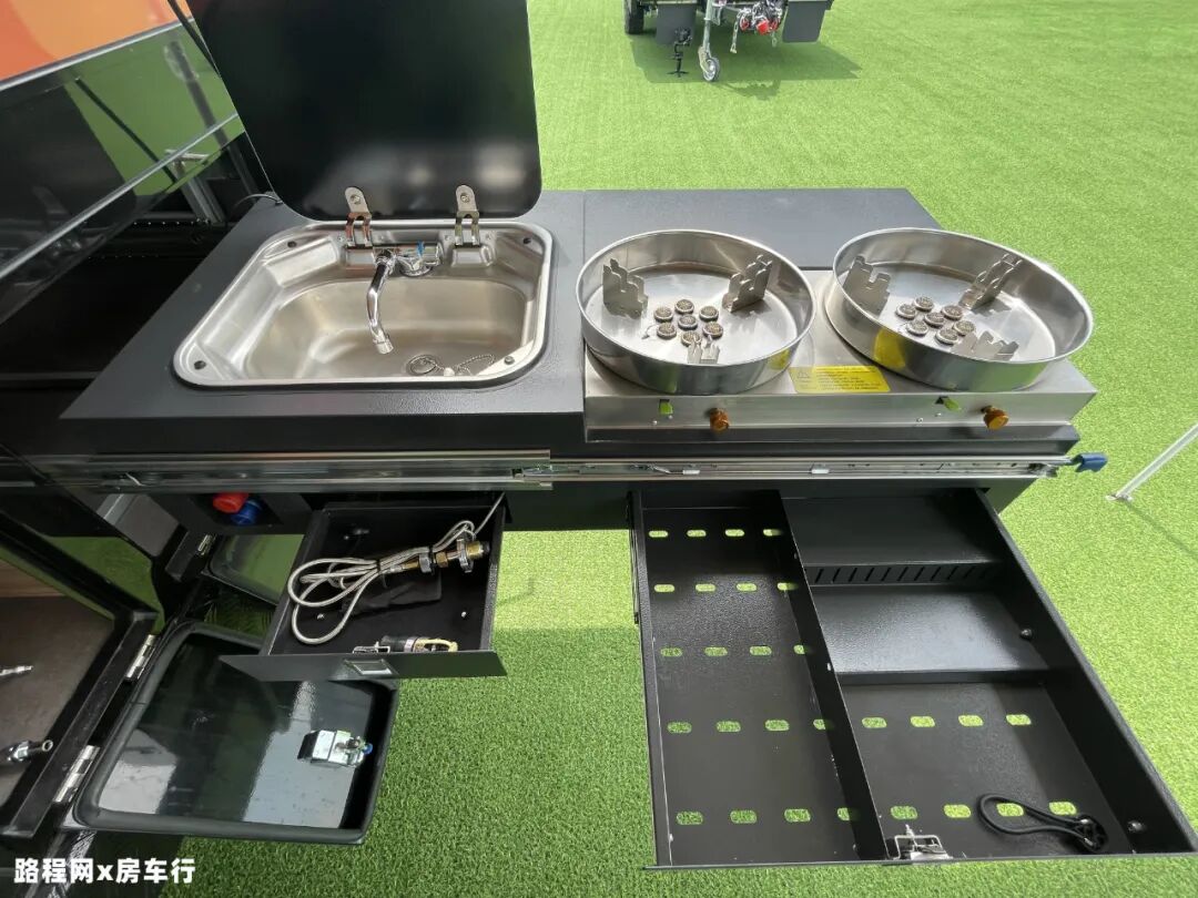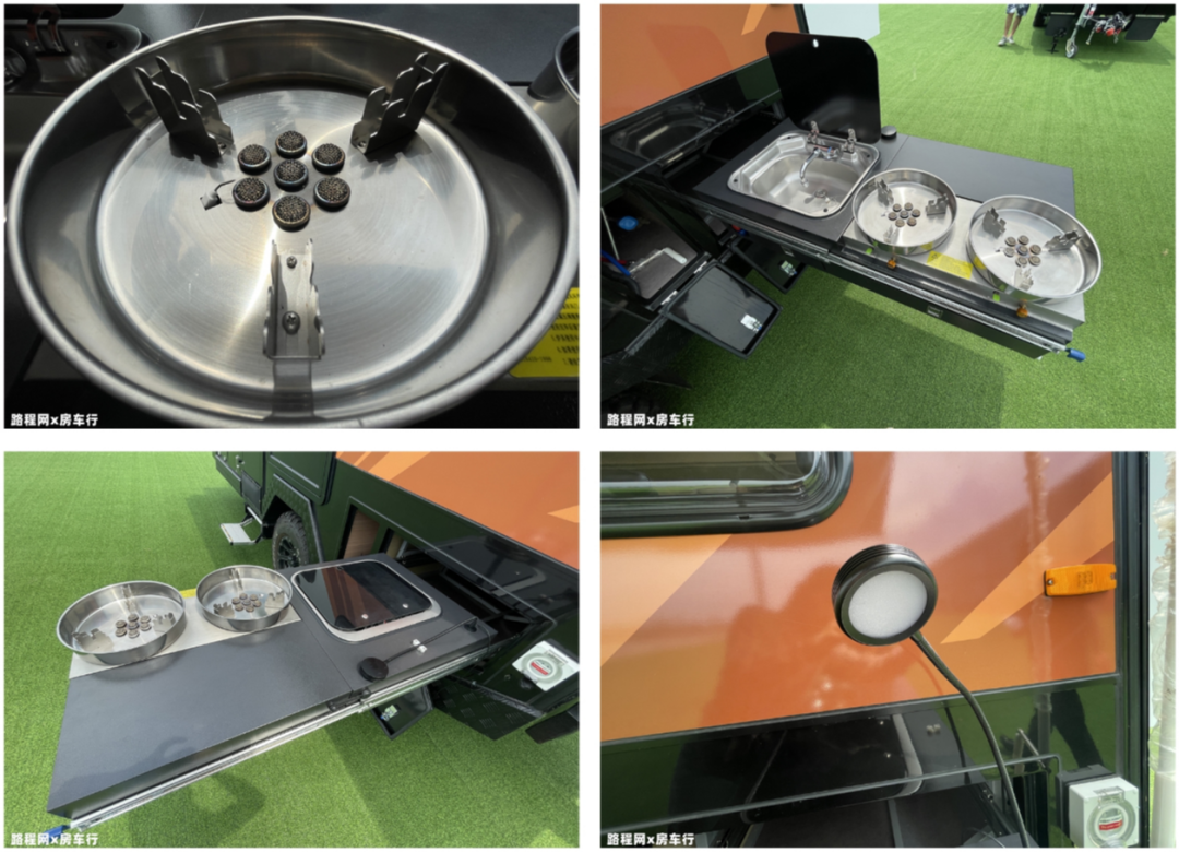 户外厨房集成了两眼七星猛火灶、收纳柜、置物格、盖板式洗菜池、折叠水龙头等设施可用于户外烹饪使用,并有效避免车内做饭油烟味道过重的问题;当然,户外厨房的位置还设有照明灯方便夜间料理食材;