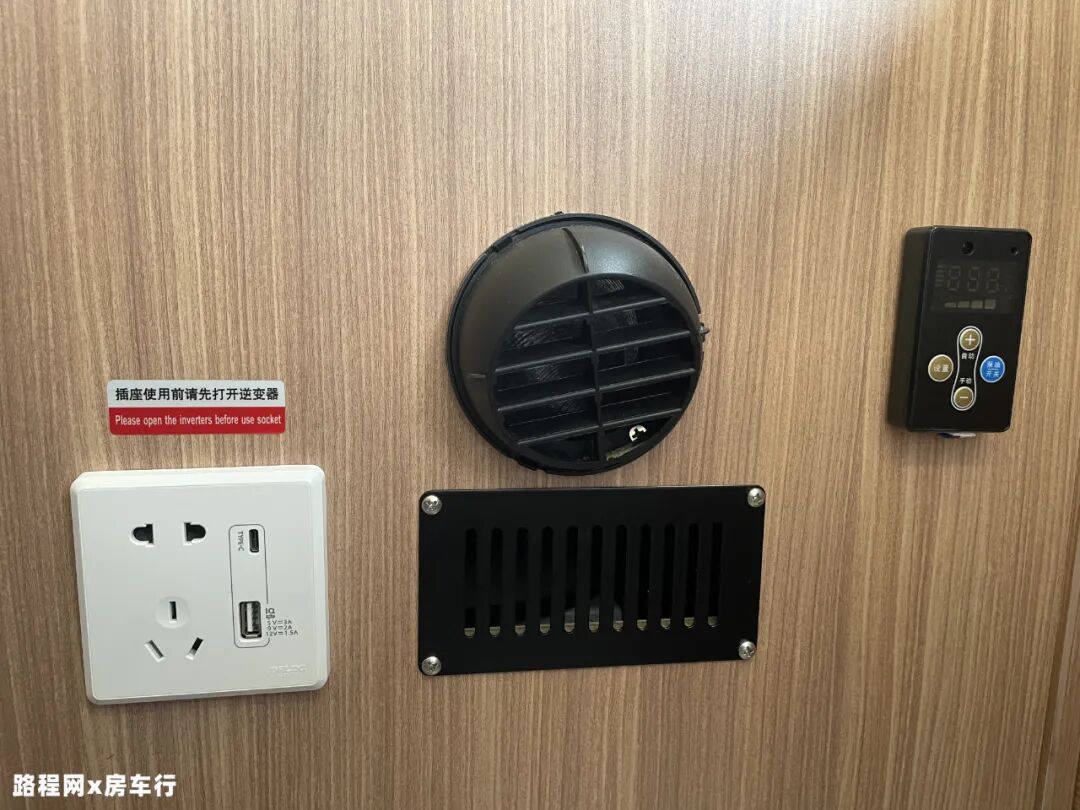 车内配置了多个220V电源、USB充电口+type-C充电口、电器开关、通风口等,加强内部旅居生活的舒适度,生活更温馨,旅行更贴心;