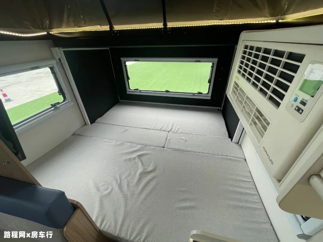尾部固定配置了一张2044x965mm的休息床,驻车时向外拓展,床铺面积可达2044x1930mm,空间充足,满足多人睡眠所需;采光、通风方面,尾部、两侧分别设有外推窗,加强内部空气循环,提升旅行生活品质;