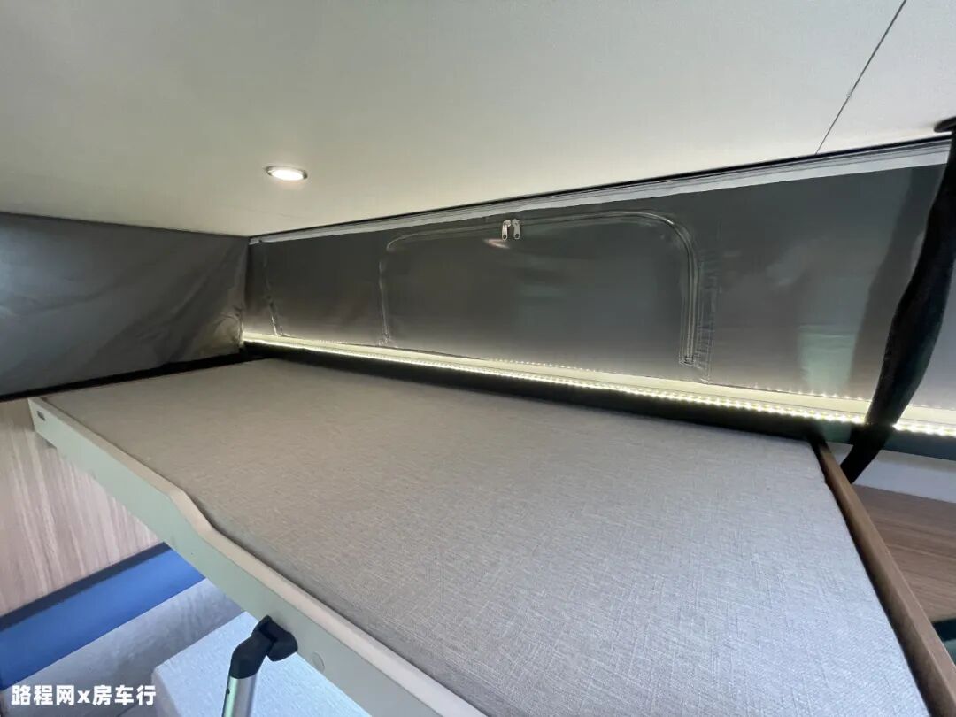 需要注意的是,上方的休息区必须在驻车升顶后才能使用,内部设有一张折叠儿童床,尺寸740x1770mm,限重60KG,用于给小孩子睡眠还是够用的,这里还是要友情提醒一下:成人慎用,假装小孩儿也不行;