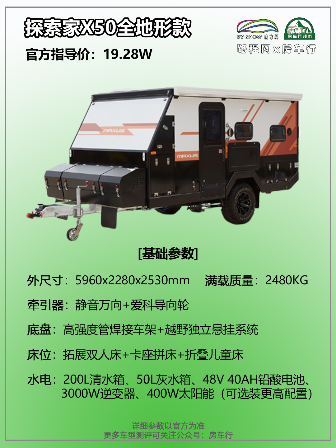 目前,上汽大通MAXUS探索家X50全地形拖挂式房车官方指导价为19.28W,大家觉得这款车怎么样呢?欢迎下方评论留言!