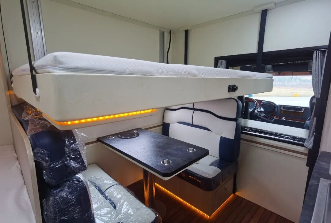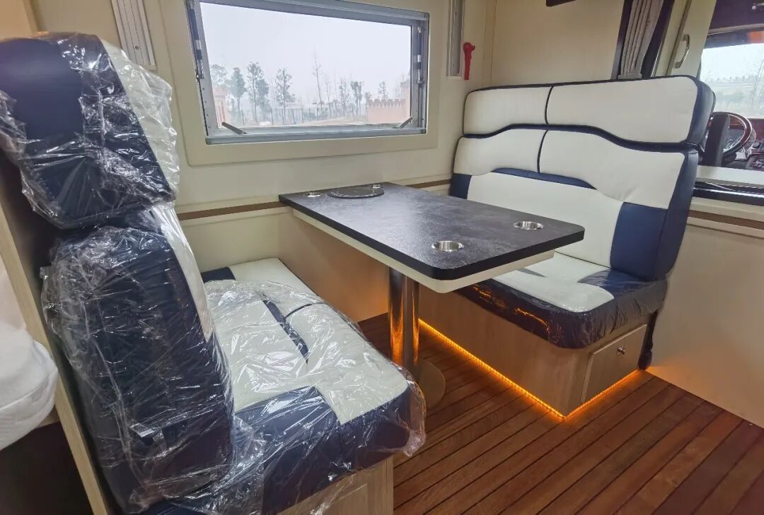 驾驶室和后部生活区采用分区设计,用一块墙板将两边隔开,并在此处设计了拉帘,日常两边沟通时可以将其打开。紧挨着驾驶室的位置是整车的生活区,采用四人对坐卡座式设计,配置了一张可升降餐桌(餐桌上内嵌有电磁和杯托)。值得一提的是,会客区座椅和餐桌可以拼床,方便临时睡卧。