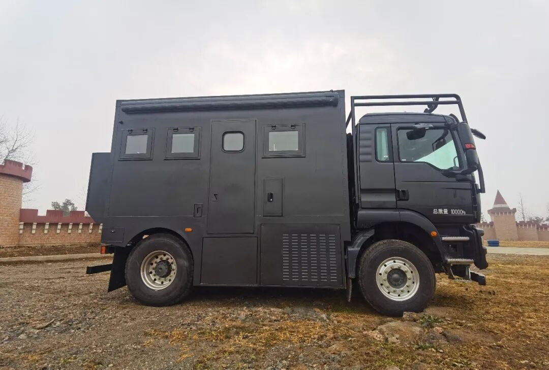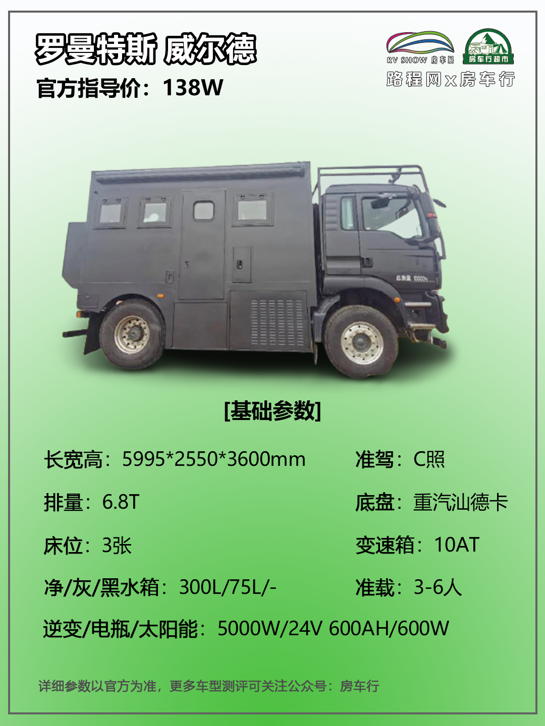 罗曼特斯这款房车车型代号为威尔德,整车采用黑色涂装,低调沉稳。乍看之下,会把它当成一辆卡车。你可能会问这款车得什么级别的驾照可以驾驶?答案是:蓝牌C证即可驾驶!这款车长宽高5995*2550*3600mm,轴距3600;整体的通过性也比较良好。整车核载3-6人,满足国六排放标准。