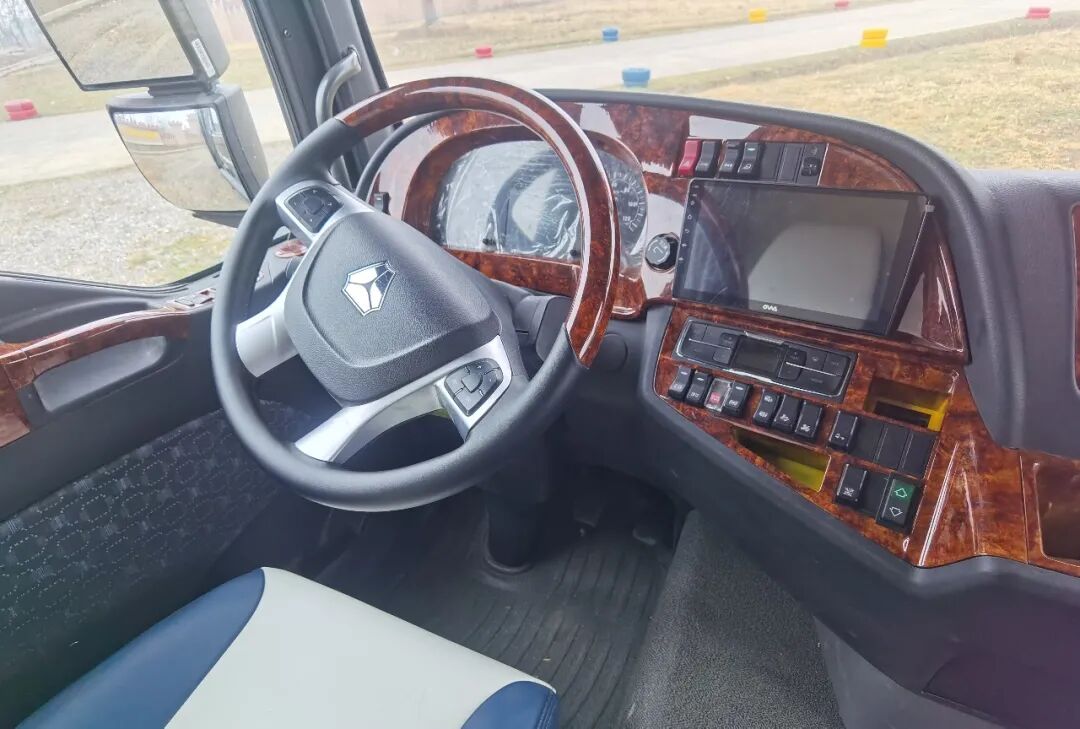 整个驾驶室空间宽敞,便利日常行动。因为车身内部离地距离较高,整体的视野十分开阔。内部正副驾驶座座椅均配备安全气囊。标配车机手机互联、GPS导航、车载智能通系统(远程诊断)底盘升降系统、定速巡航、ESP、德国ZF转向器等,提升驾驶体验的同时,也保障驾驶安全与稳定。