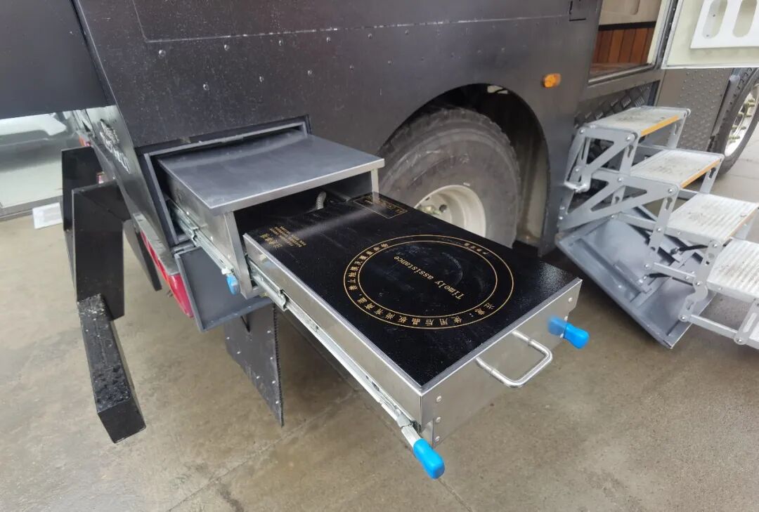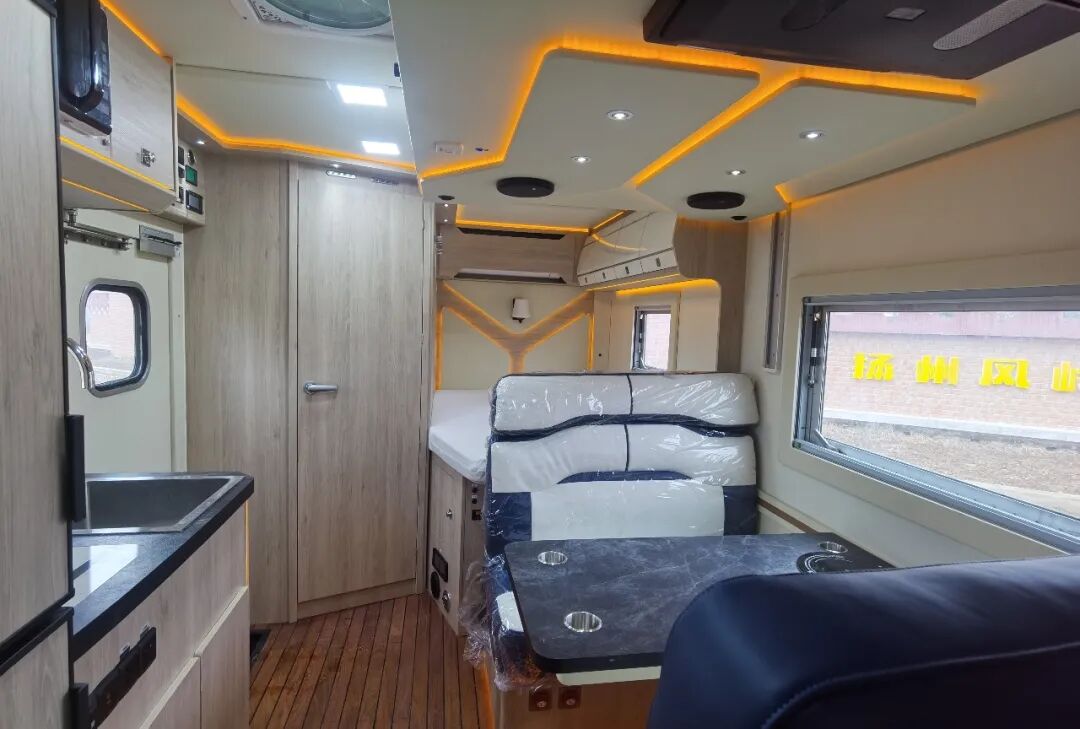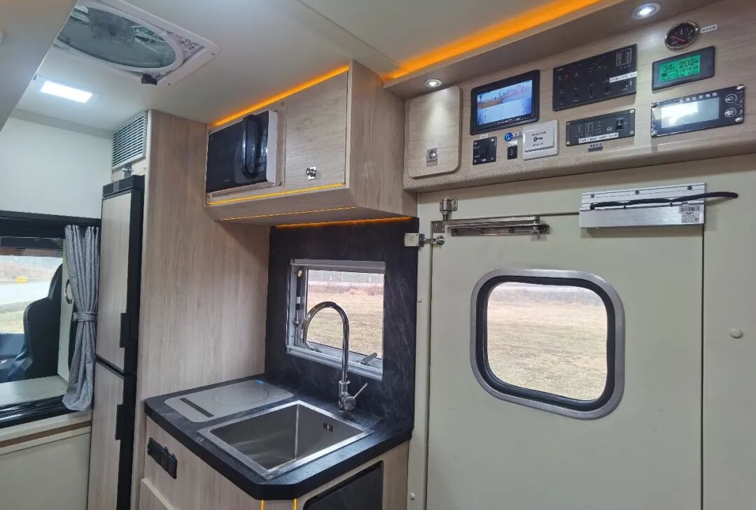 水电配置方面,整车标配300L清水箱、75L黑水箱、5000W逆变器、24V600AH磷酸铁锂电池、800W单晶硅太阳电池板,水电配置规格相当不错,可保障更长时间的旅游使用。