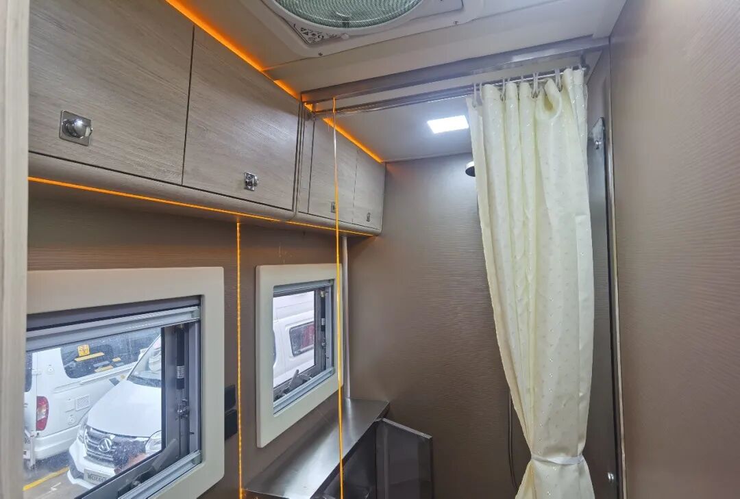 会客区正上方设计有十速雨感换气扇,可保障车内的换气通风。此外,这里还设计了一张隐藏式单人吊床:吊床可以一键自动升降,非常便捷。床下还配了一台27寸吸顶电视,平时可以打开在会客区追剧观影,吊床降下来休息的时候则可以折叠收起。