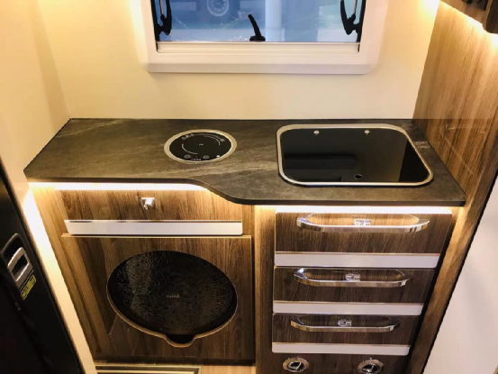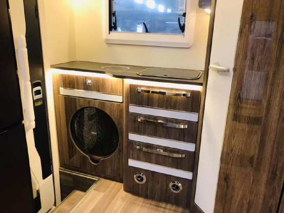 打开车门,第一眼看到的就是室内厨房,黑色纯净的台面,下方实用的储物抽屉,以及一台3KG带烘干功能的洗衣机,合理的运用每一寸空间。