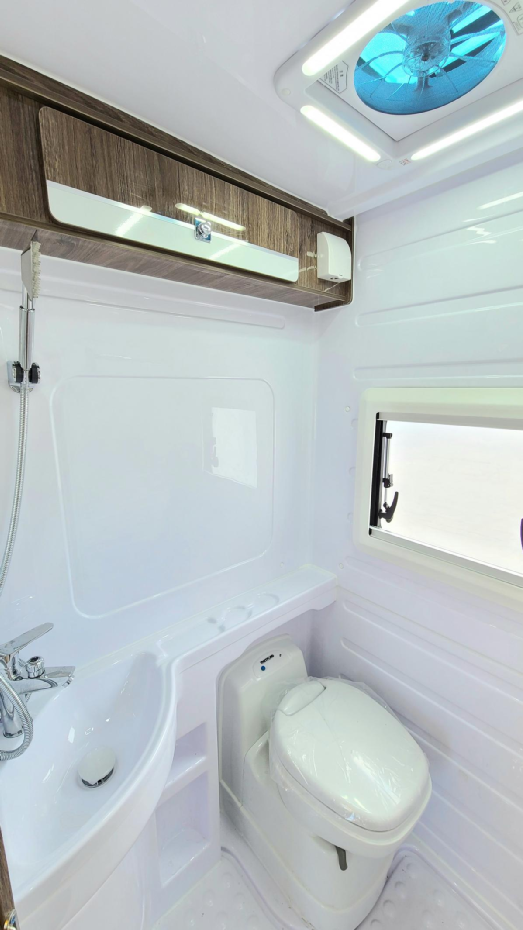 镶嵌式电磁炉、翻盖水槽+可折叠水龙头、油烟机以及储物吊柜,整体看起来干净美观。当然,冰箱和微波炉也是必不可少的,148L房车专用冰箱,可以满足食物的存放,让旅行的每一天都可以品尝到新鲜可口的饭菜。