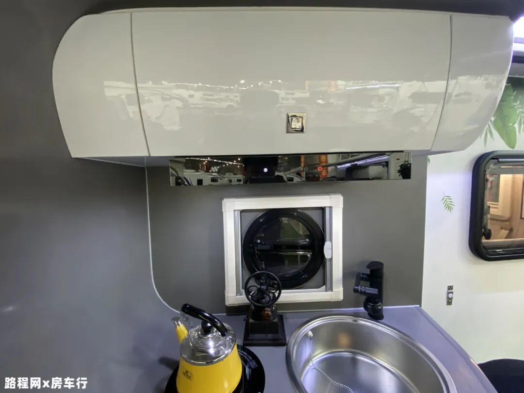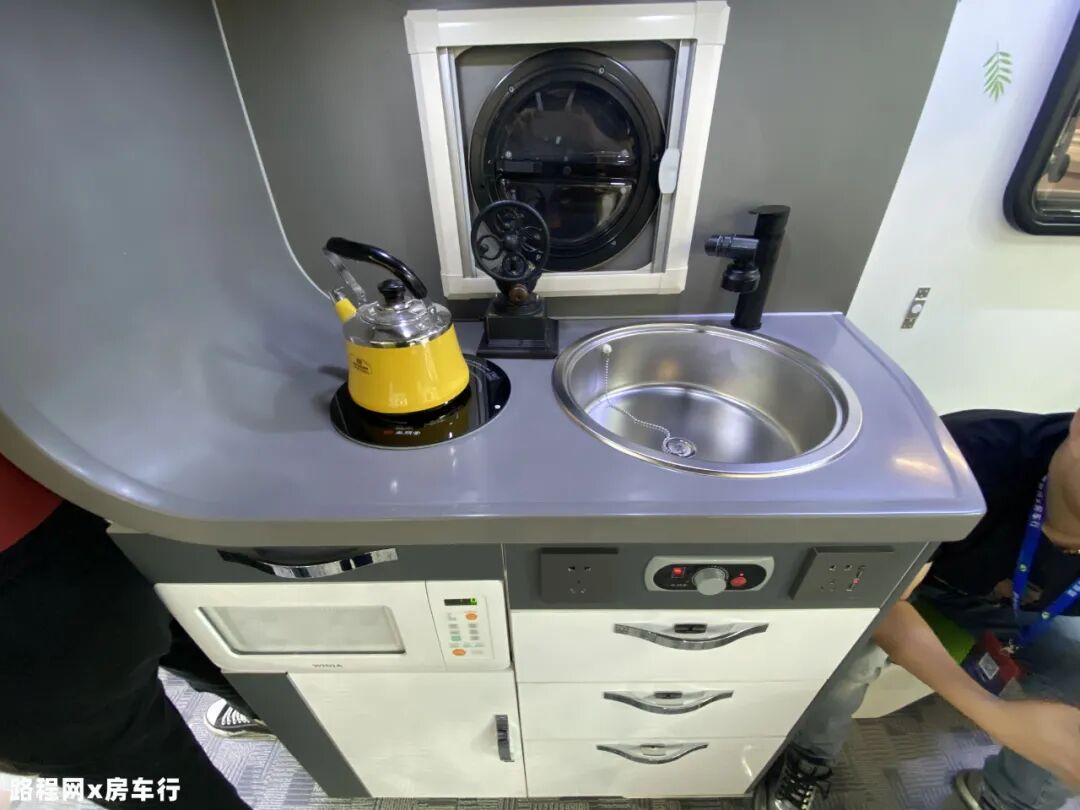 厨房区配置了电磁炉、厨具、洗菜池、水龙头、微波炉、12V车载抽油烟机、五孔插座、抽屉、储物柜等设施,充分满足日常烹饪使用;