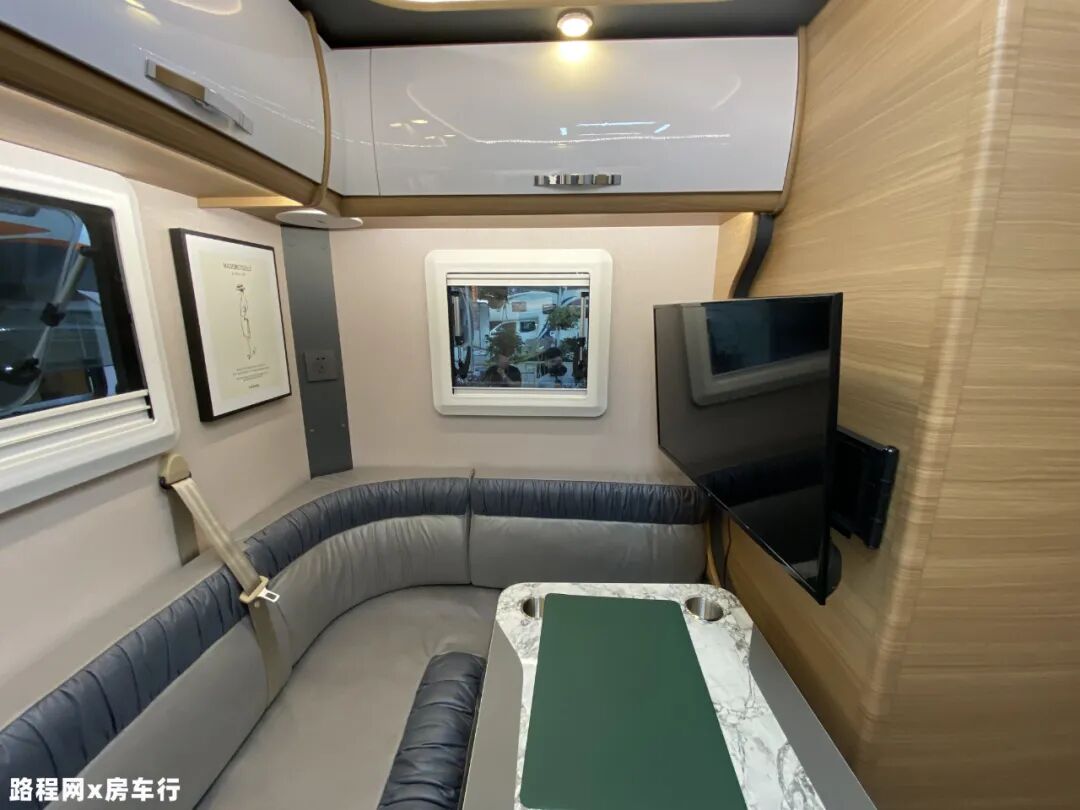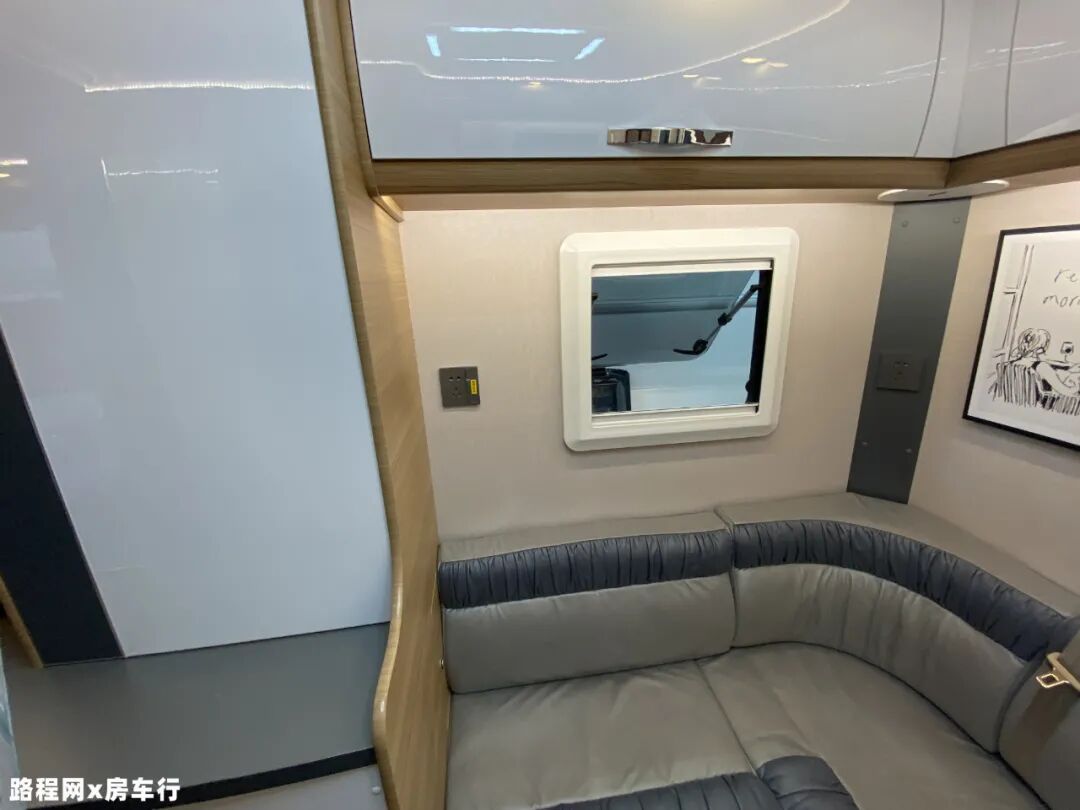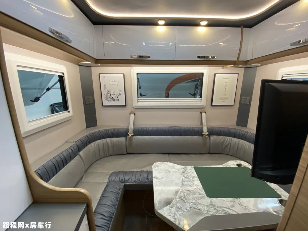 后方会客区设有环形沙发,中间配有旋转升降式餐桌方便车上人员使用,同时会客区可根据个人需求转换为床供临时休息睡眠使用,睡眠空间进一步增加;会客区上方环绕着搭载多组吊柜,加上车上其它的储物空间,充分满足日常存储物品的需求;