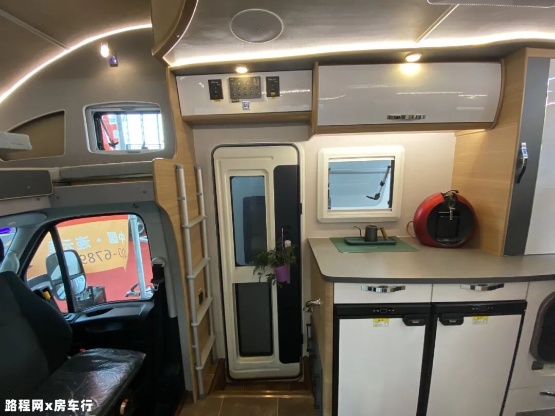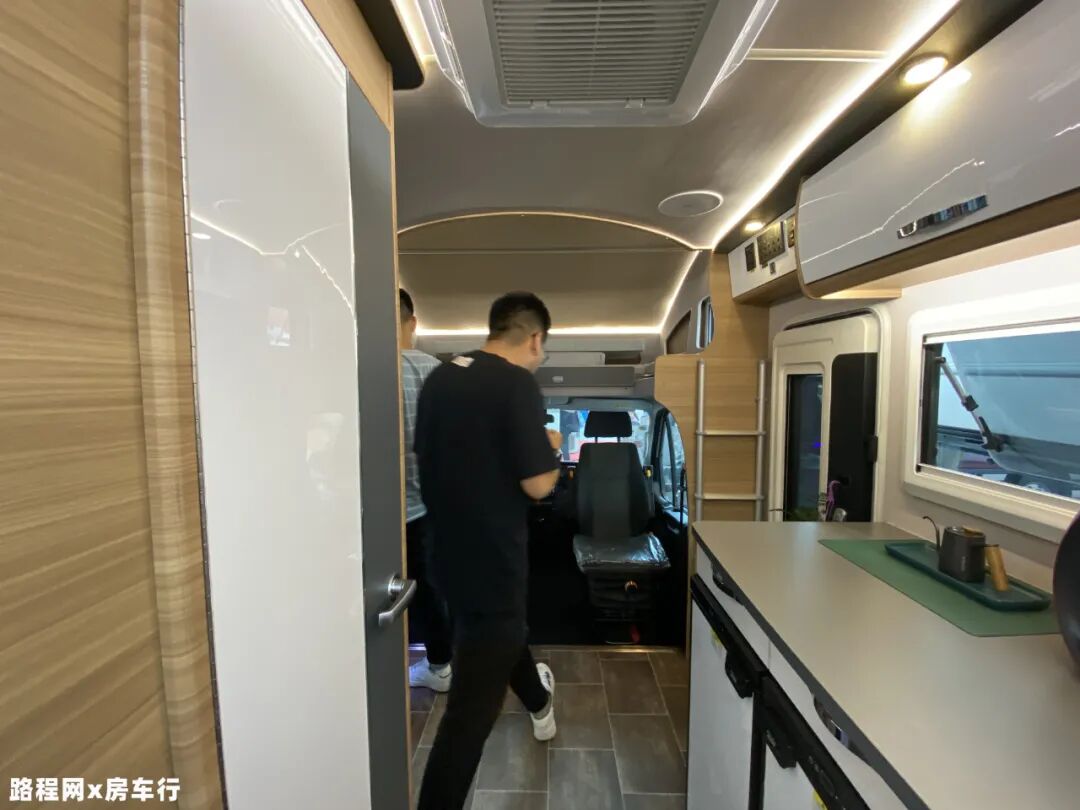 右侧设有乘客门,方便驻车未展开露台时上下车,乘客门上方为车内水电控制集成区,左侧设有扶梯方便上下额头床;