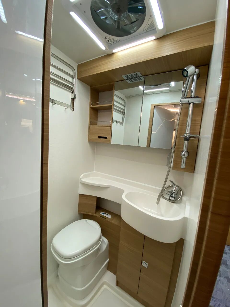 一体式卫浴间位于车身左侧中部的位置,内部配置了赛特福德进口马桶、洗漱池、独立淋浴花洒、浴镜、储物柜、储物格、置物台、毛巾架、双向换气扇等设施,满足车上人员卫生、洗漱的需求;