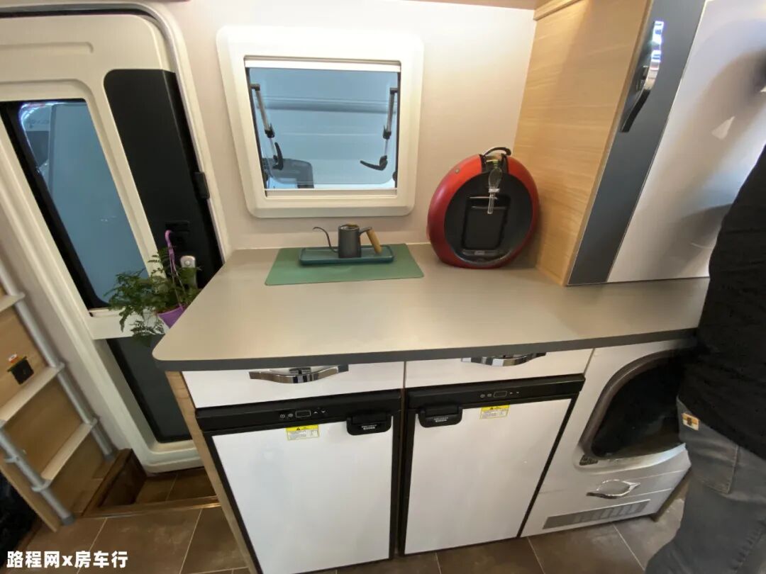 乘客门右侧为操作台,可搭配厨房使用;台面下方设有英得尔双层独立式冰箱方便日常储存食材;右侧配置了洗衣机方便旅居时清洗简便的衣物;同时该区域设有多处储物空间;