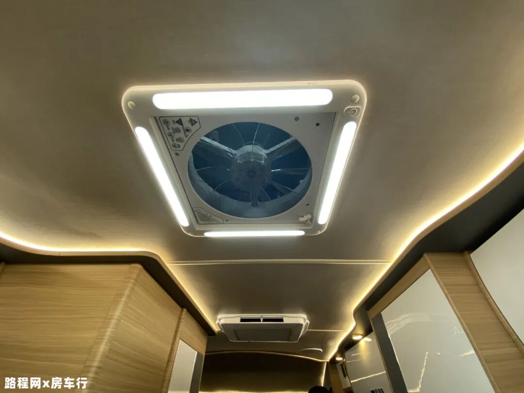 生活区设有换气扇、家用空调/顶置空调、特鲁马底置式单冷空调等设施,满足车内供暖、制冷的需求;同时顶部设有氛围灯带、多个照明灯加强生活区内部照明,内部空间明亮但不会有刺眼的感觉,整体旅居氛围舒适性方面也得到不错的提升;