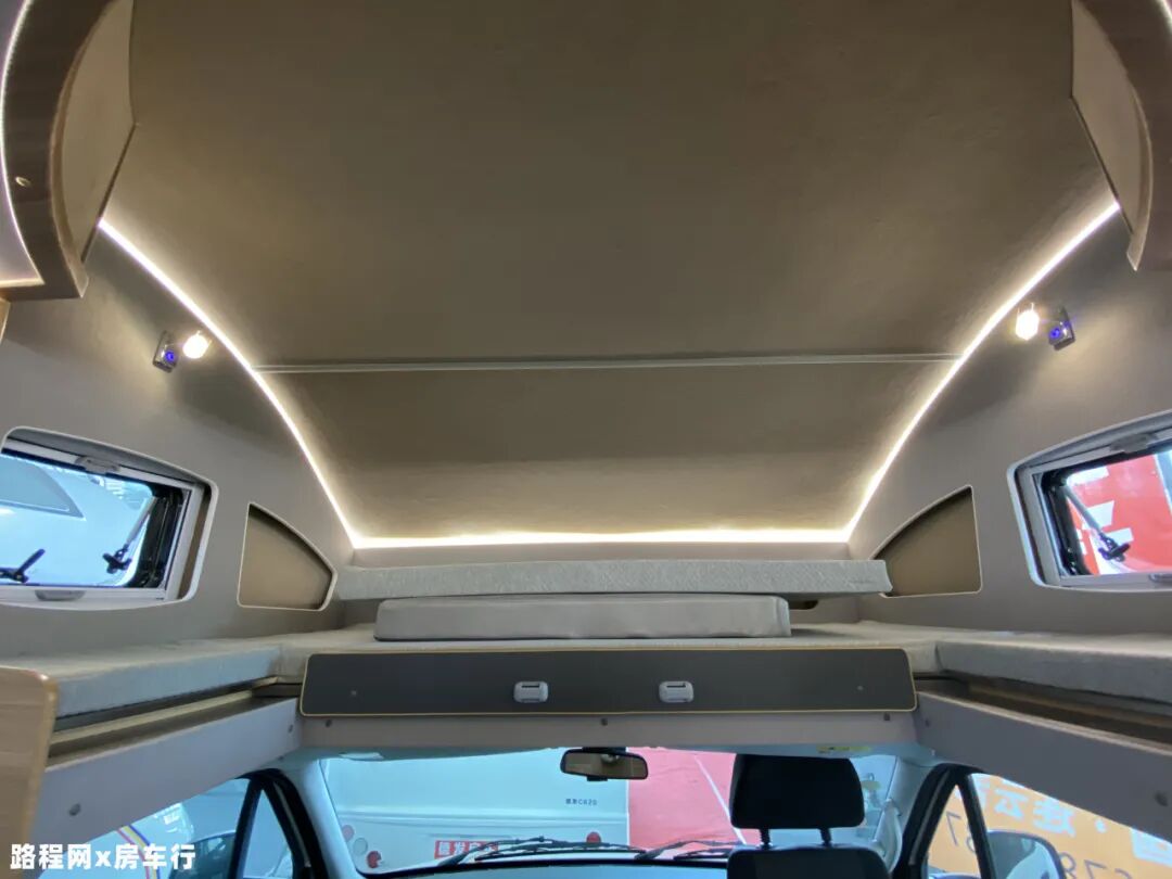 驾驶舱上方额头床的部分为车内主要休息区,推拉式的设计也方便了日常使用,内部空间充足,可满足多人睡眠的需求;采光、通风方面,左右两侧分别设有外推窗,顶部设有氛围灯带、阅读灯,满足内部生活使用;