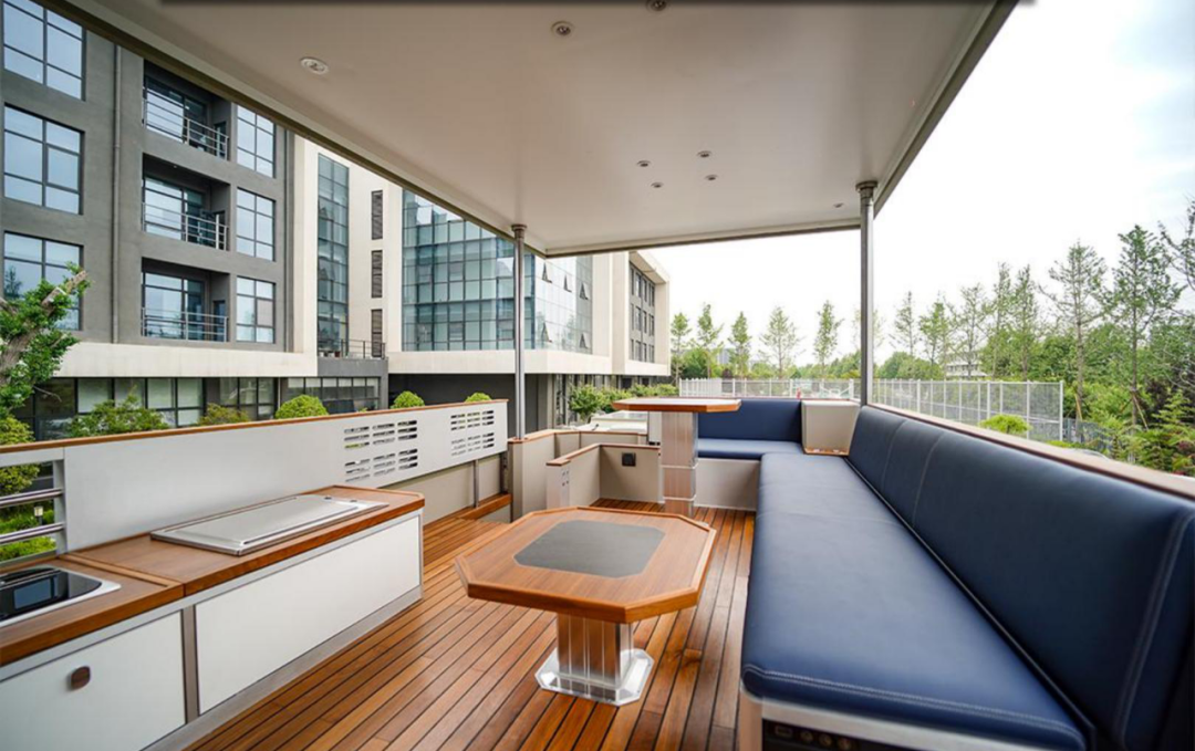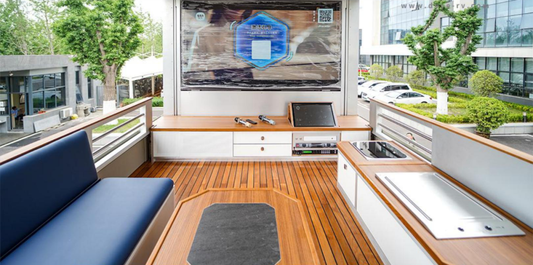 来到露台后,举目所见,皆是惊喜!首先映入眼帘的是一个85寸的超大电视(车头方向),可升降超薄液晶电视搭配进口影响给你最酣畅淋漓的户外观影体验;此外,电视下方设有嵌入式卡拉OK系统,要在野外来场刺激的轰趴吗?嗨唱起来!