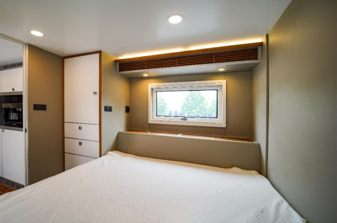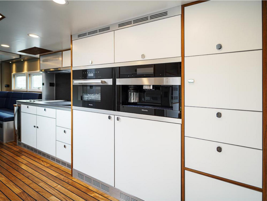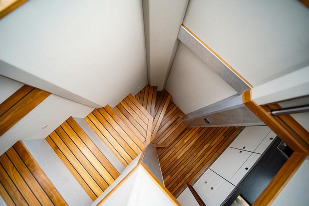 内部生活区看起来高端、大气,没有过份奢侈,整体透漏着沉稳、内敛的气息,更符合高端人士的身份;底部铺设顶级船用柚木地板,采用植物油抛光(无化工油漆)+橡胶防滑条处理,搭配高冷灰与纯柚木实木内饰,内饰部分在视觉方面所呈现的效果非常出色;