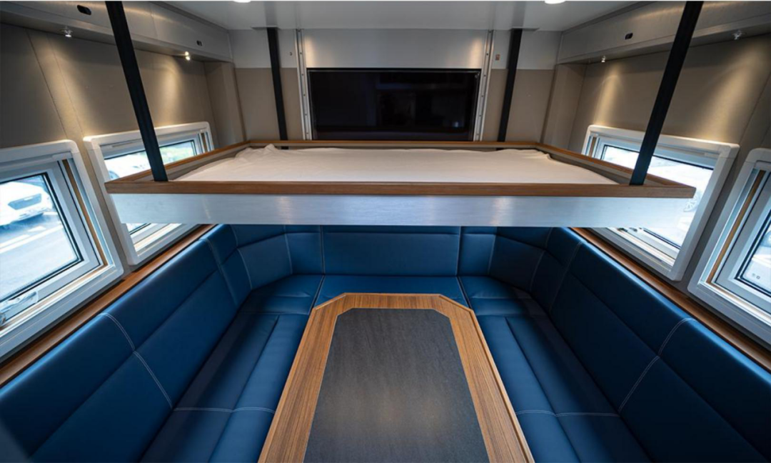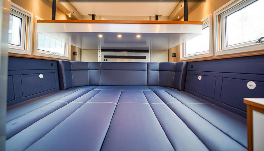 此外,会客区的U型沙发搭配升降式餐桌也可拼成一张尺寸为2000x1800mm的双人床,睡眠空间进一步增加,充分满足多人出行时的睡眠需求;
