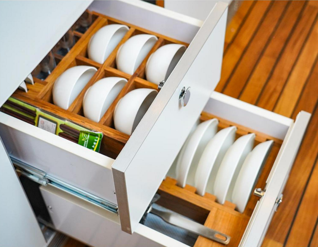 厨房区设有多个带锁的抽屉和橱柜,内部配置了全套德国进口厨具,刀具、餐具一应俱全,分类存放,每一个物品都有固定的位置,防止行车时受到磕碰影响;