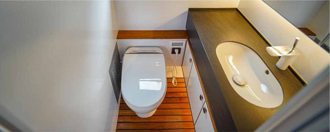 干湿分离的卫浴间自然也是标配,淋浴间、洗漱间各自独立,日常使用更加舒心;内部设有美国进口全陶瓷电吸马桶、洗漱池、置物台、储物柜、淋浴花洒、德国进口自动恒温混水器、美国进口排风系统、浴镜、毛巾架等设施,满足车上人员日常卫浴所需;底部沥水板有效避免地面积水;至于换下的衣服怎么办?车上还设有德国进口嵌入式全自动滚筒式洗衣机方便对衣物进行清洗;