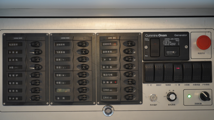 而在电路方面,这款车配备了24V 840AH磷酸铁锂电池组(20.16KW/H,等于12V 1600AH)、美国5KW超静音水冷柴油发电机、荷兰8000VA逆变充电一体机等,与之搭配的还有诺马迪森全自动大功率混合供电系统、荷兰电池隔离器、24V LED照明系统、德国进口开关、制式插座、荷兰太阳能充电管理系统、新西兰配电盘、德国进口2.4KW下装式冷暖空调x3等;