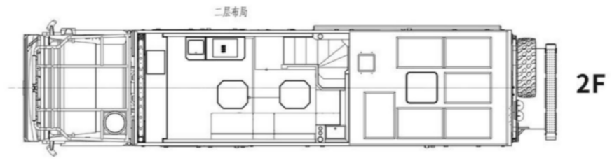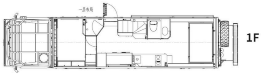 车内生活区一层的布局从左至右依次为驾驶舱、独立卧室、储物空间、标准厨房、干湿独立卫浴间、会客区U型沙发;