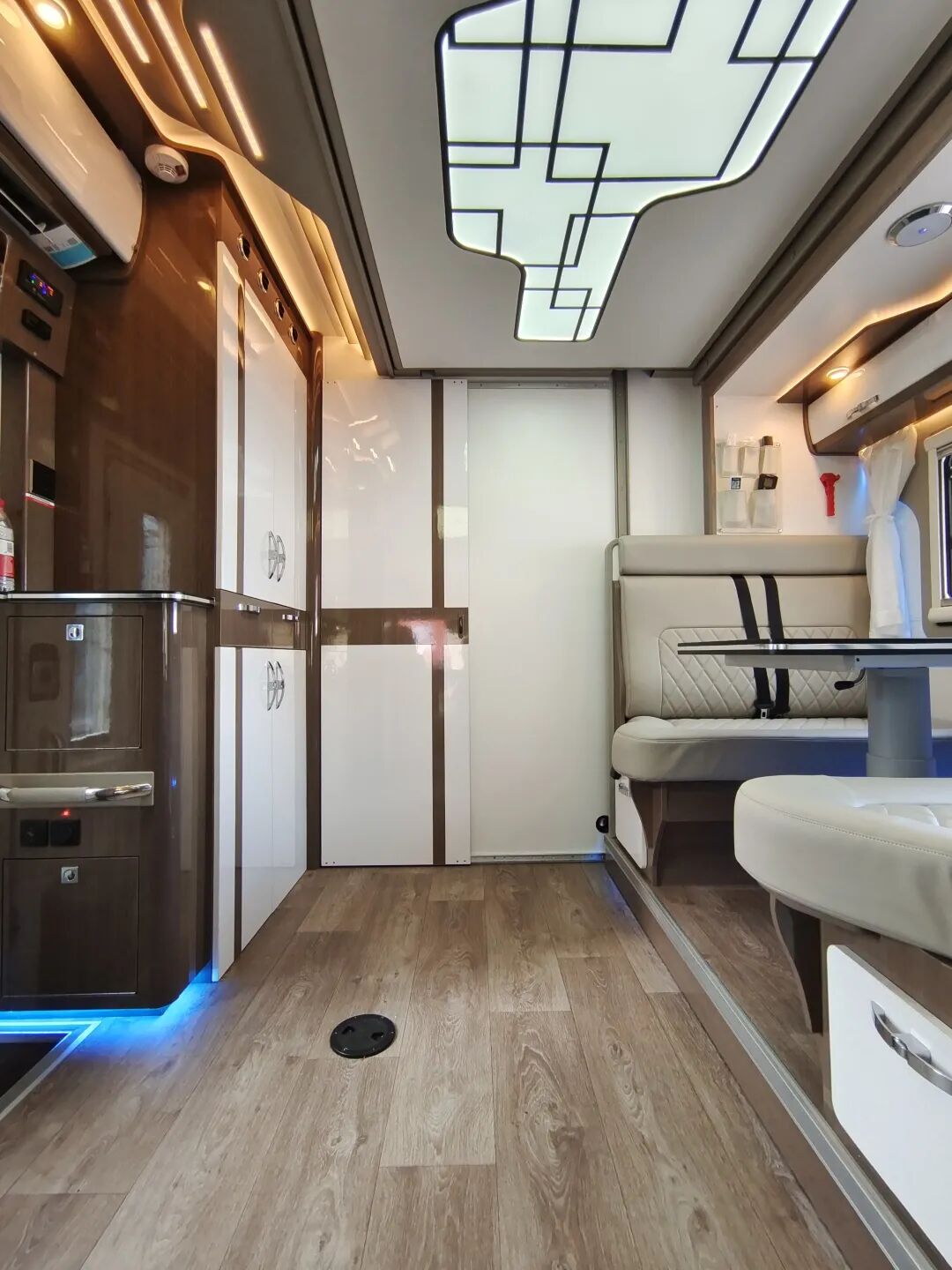 房车的内部空间整体采用棕咖啡色设计,搭配白色柜门及暖色灯饰,营造出浪漫、华丽的氛围。车内依次设有额头休息区、会客厅、厨房区、卫浴区,可满足野外生活的基本需求。