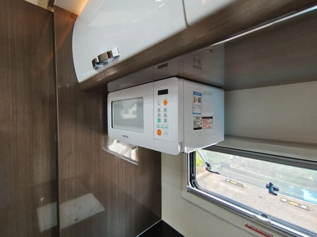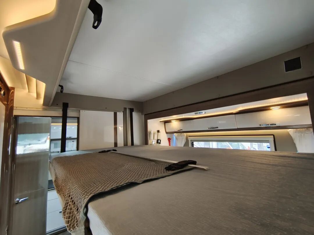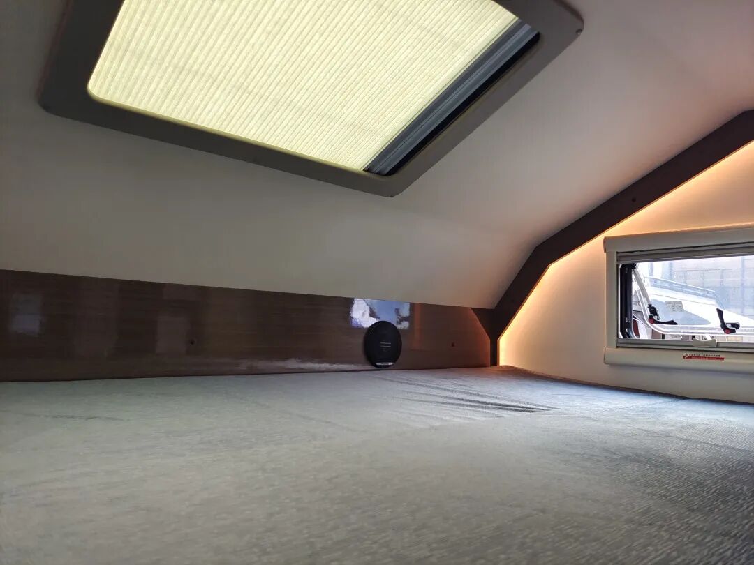 驾驶室上方额头休息区设有双人床,左右两侧都有外推窗,顶部还设有天窗,可观赏旅途风景,在满足休息的同时为旅行增添了不少乐趣。打开车窗后,车内的空气也可以快速流通,给内部空间带来新鲜空气。