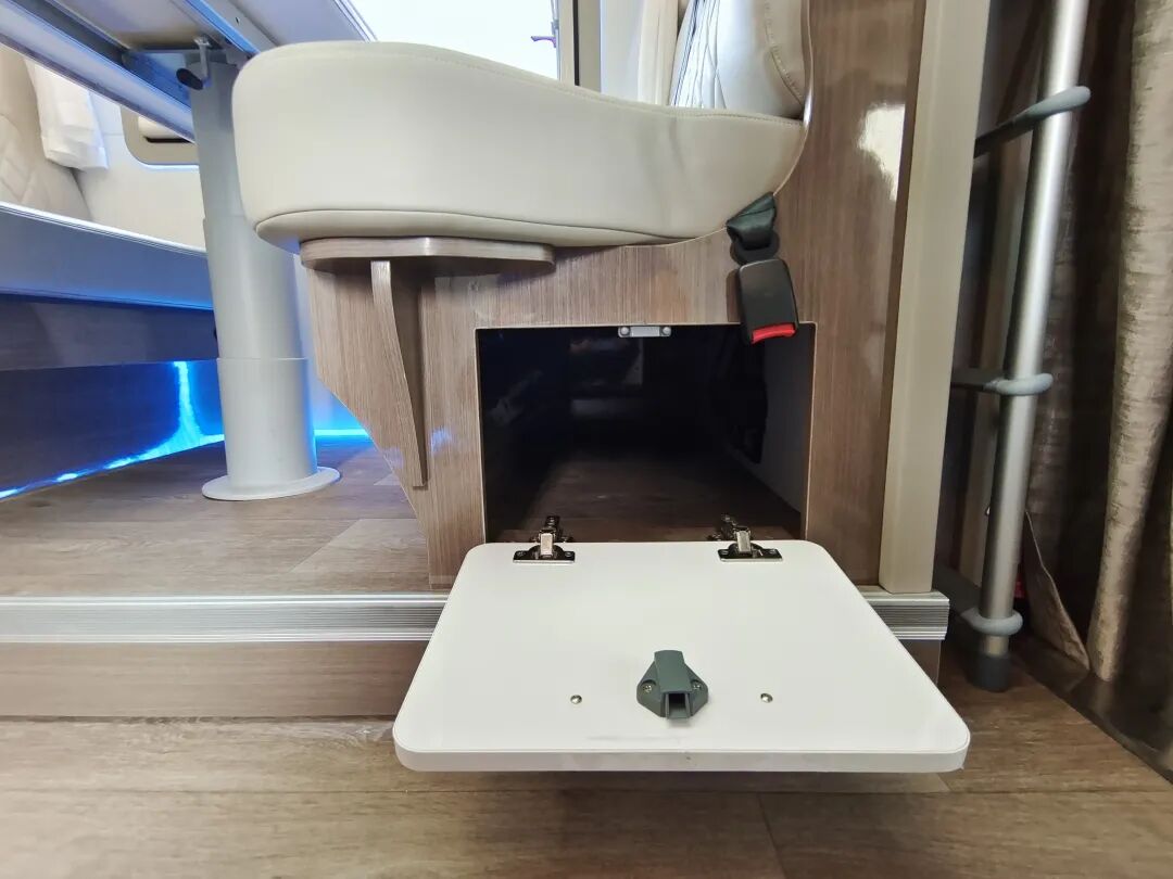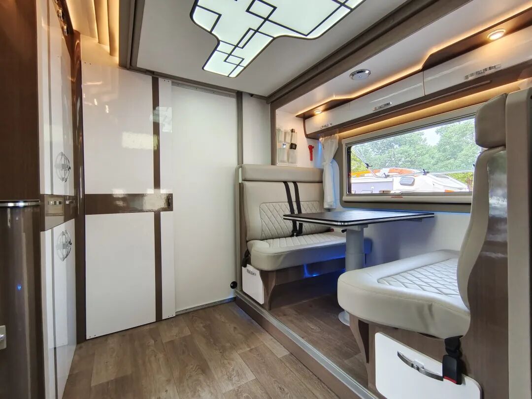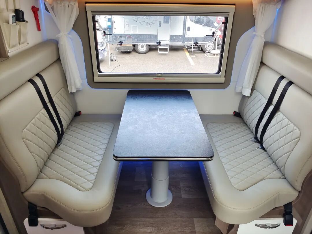 会客区设有双向卡座沙发,可供4人乘坐,双向卡座都配有安全带,可保障行车途中安全乘坐。卡座中心位置配有可升降圆角餐桌,降低餐桌后,双向卡座也可以拼床,供休息使用。