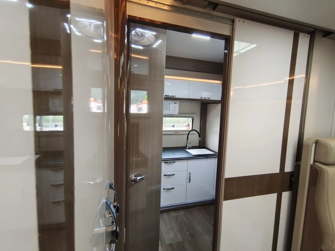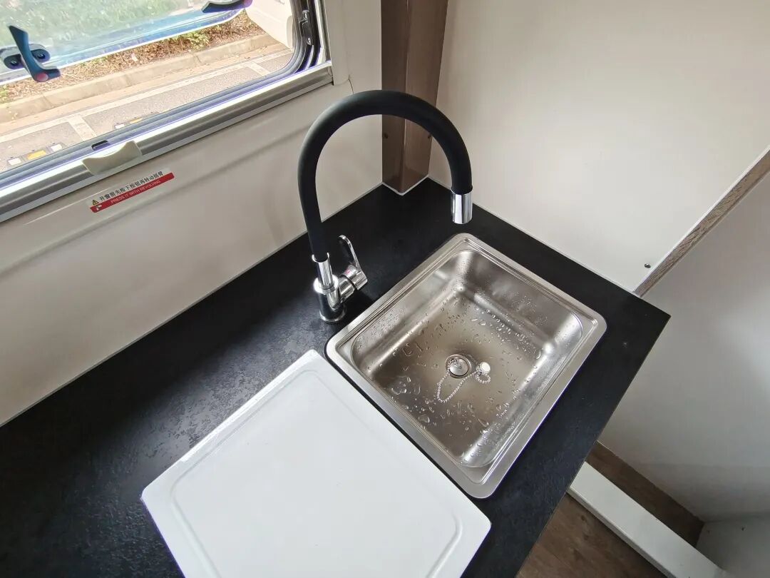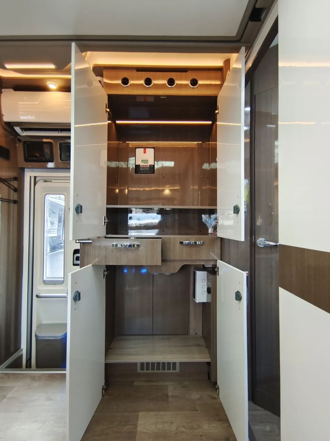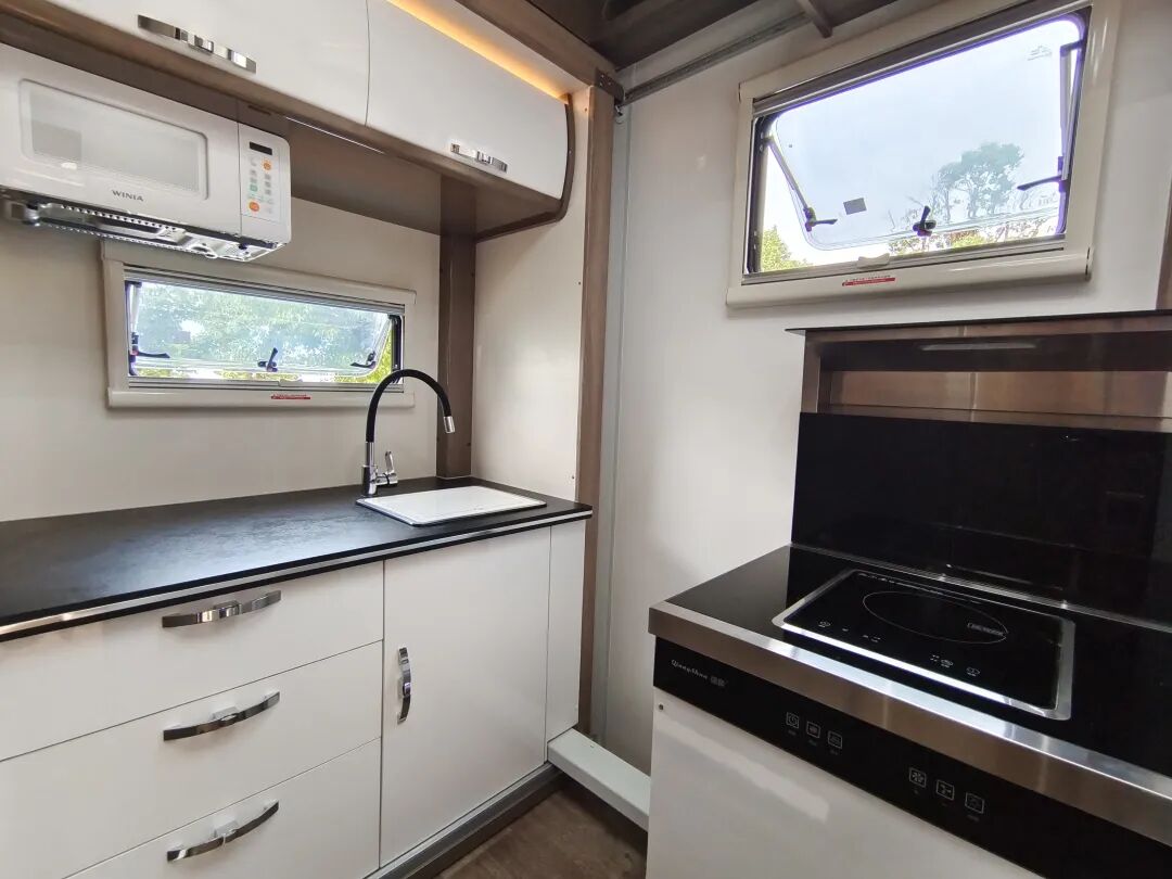 厨房区采用独立式设计,配有专用水槽、独立龙头、独立的操作台、一体式橱柜、电磁炉等,橱柜上方还设有两个小型储物柜;得益于后全拓设计,厨房区有更大的操作空间,使日常烹调更加方便、舒适。