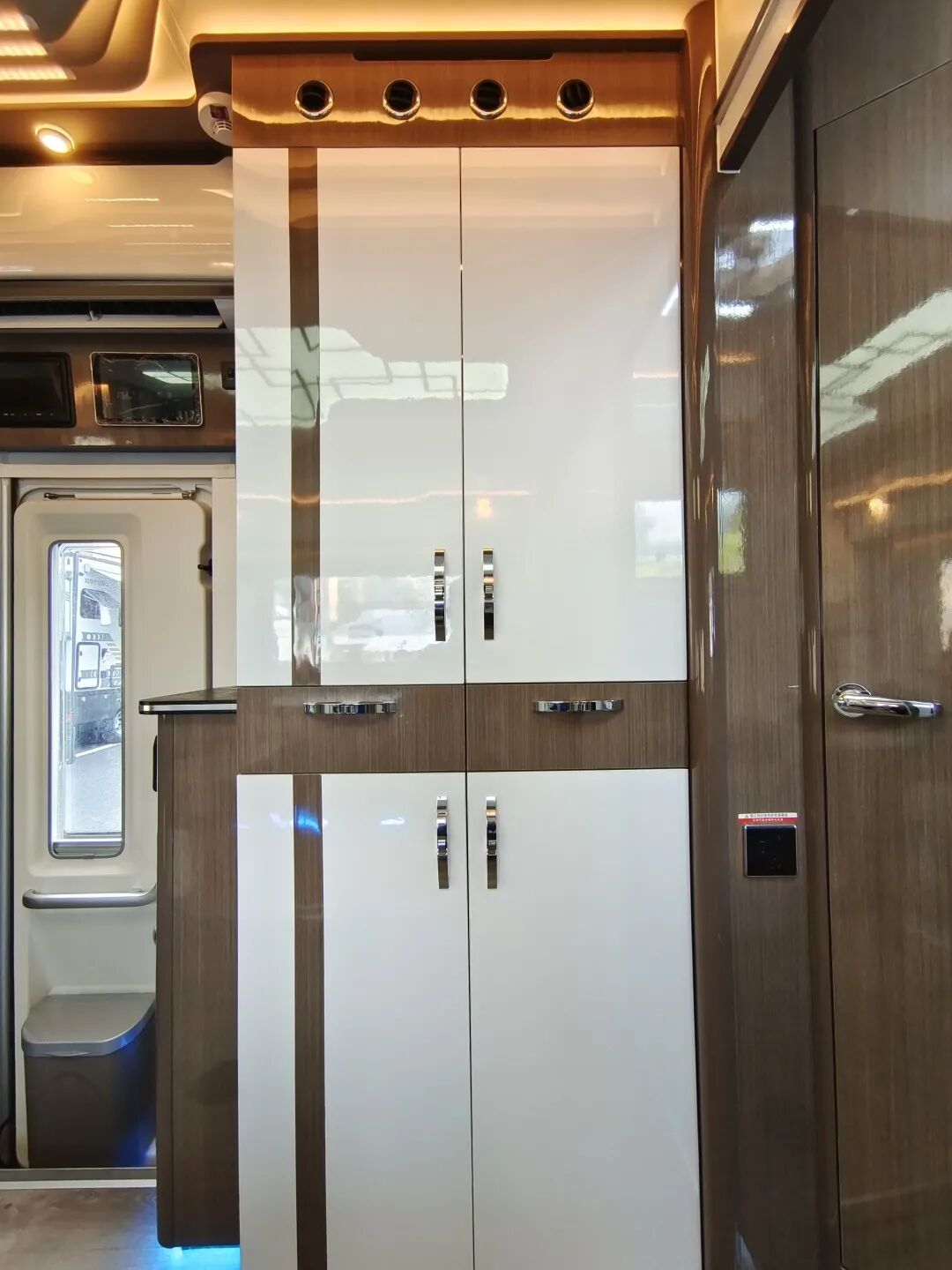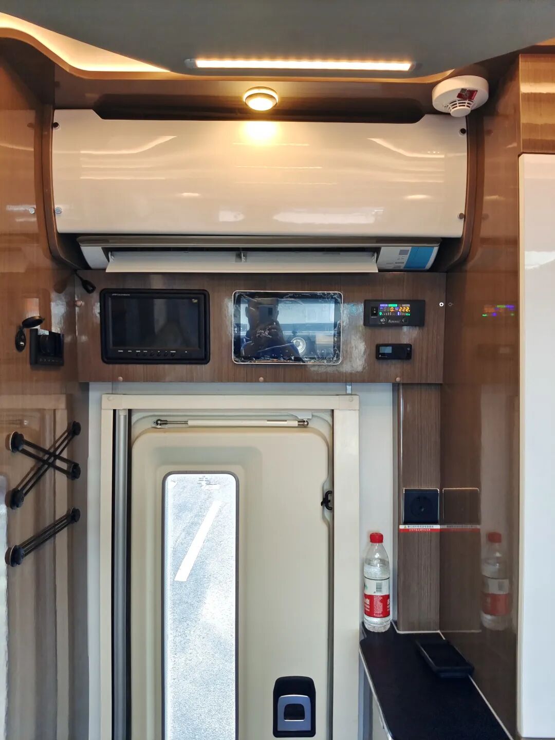 乘车主门上方是总控面板,可控制车内灯光及电气设备的开启与关闭;总控面板上方是1.5P家用变频冷暖空调,用于调节房车内温度。