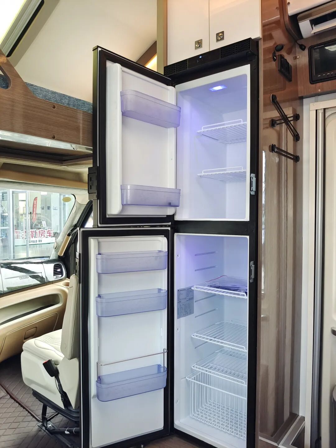 紧邻副驾驶位置,设有房车专用双开门冰箱,可以为蔬菜、水果等食物保鲜。