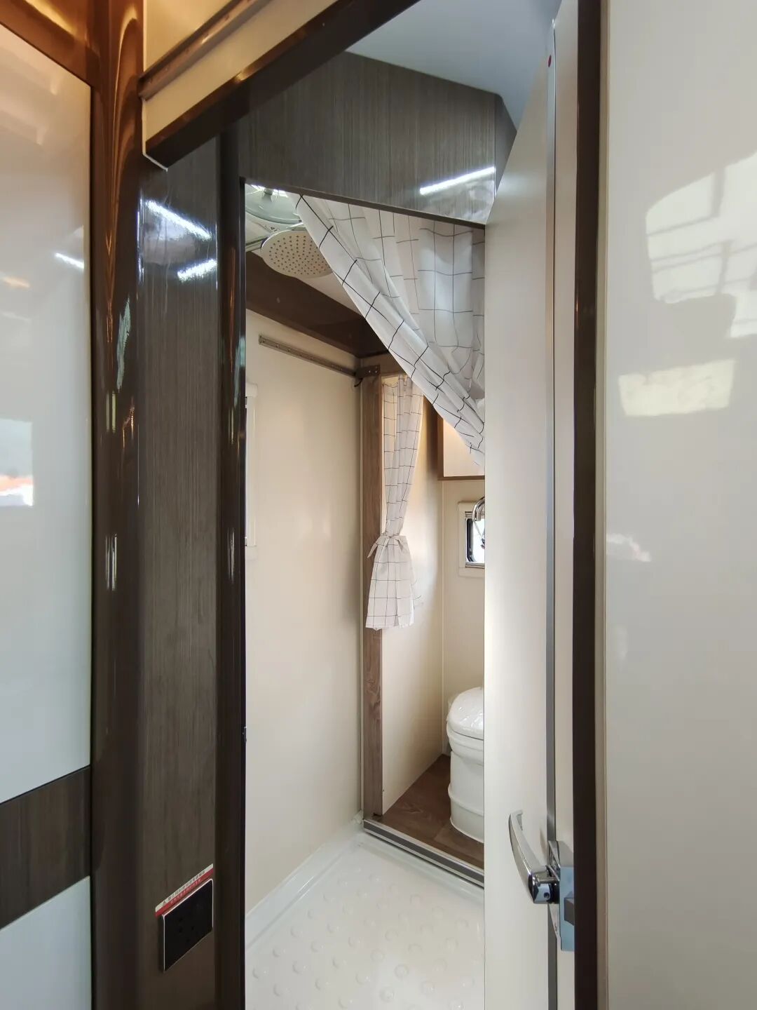 卫生间采用干湿分离设计,兼具美观便捷的特点,内部配有洗手盆、房车专用盒式座便器、淋浴花洒、毛巾架等,可满足日常盥洗、梳洗、沐浴使用需求。