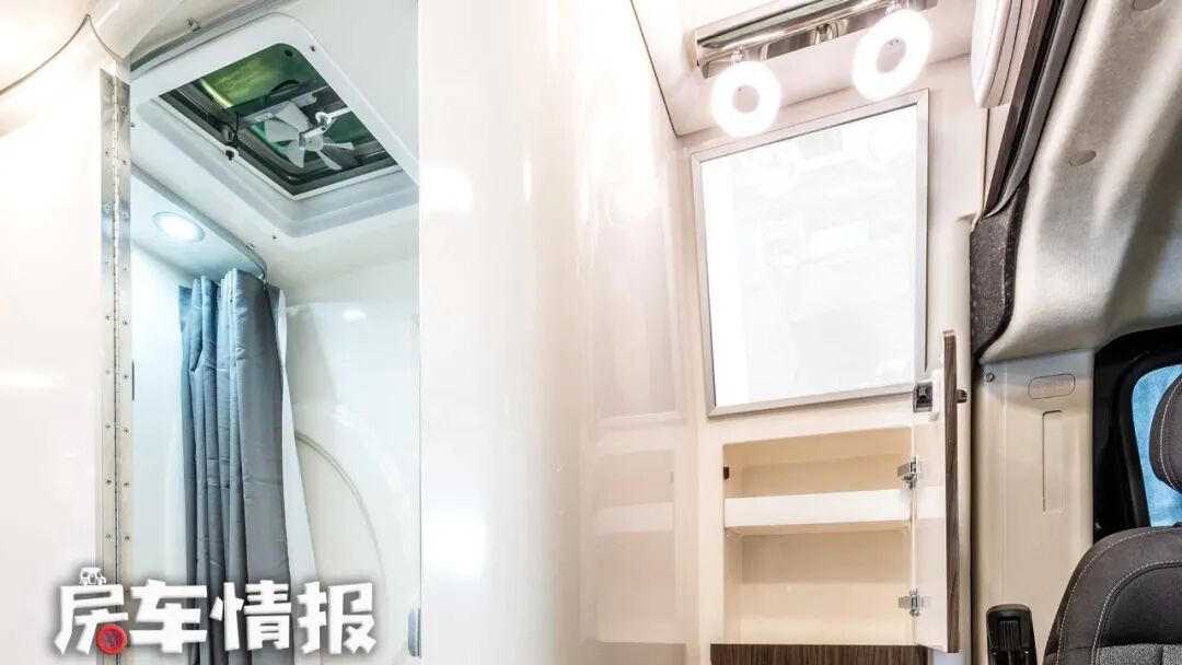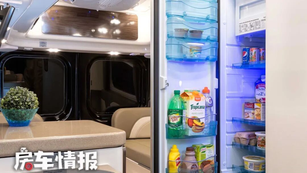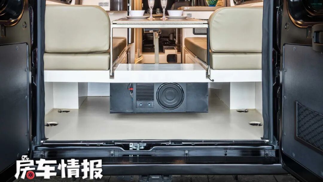 这款房车内部配有暖风机和空调可以时刻保证车厢内部温度适宜。以及带有600W太阳能板提供电力,车内配有一台专用发电机。车辆中部还配有152L的超大冰箱可以满足日常新鲜食材的存储。