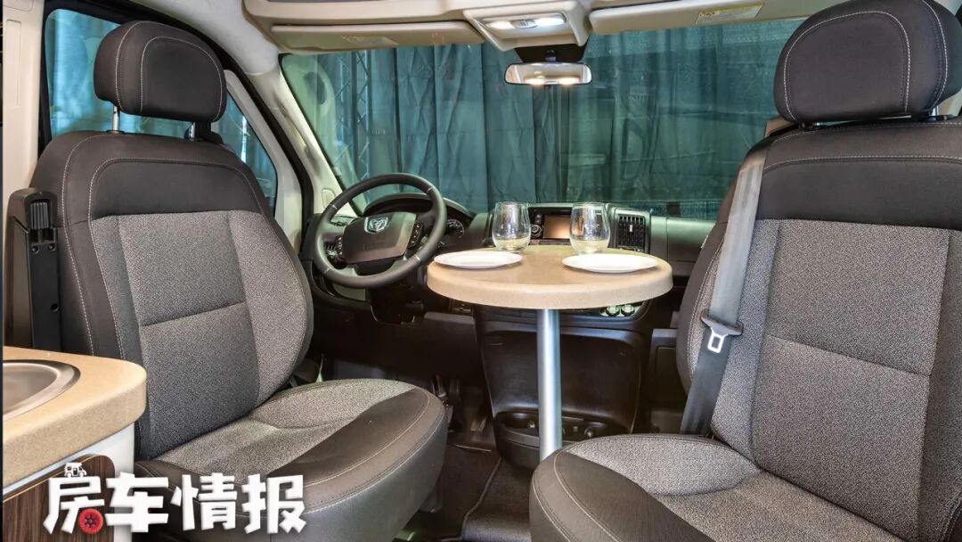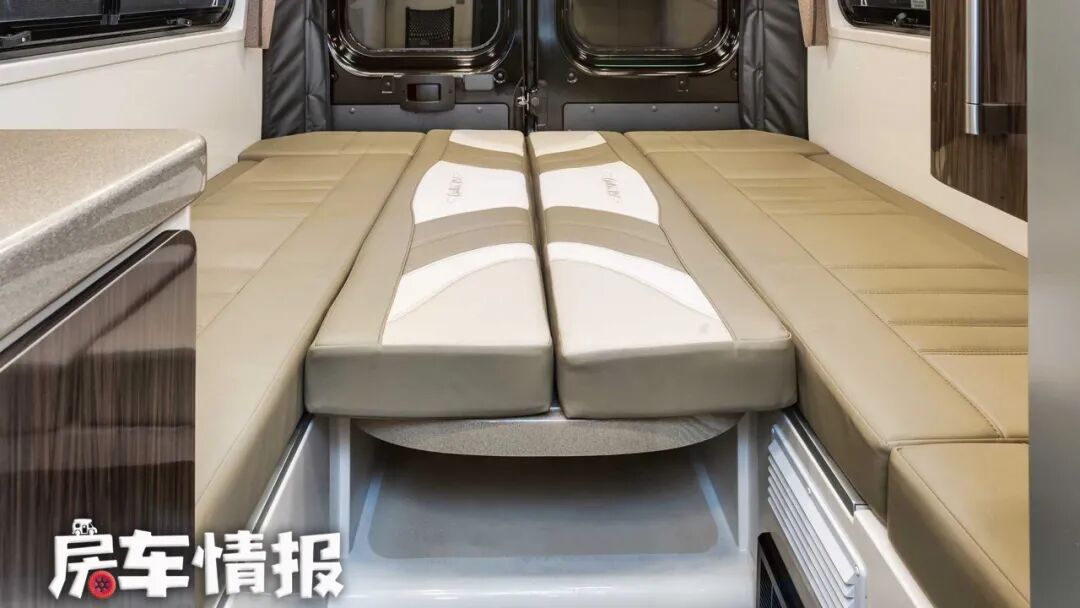 到了晚上,后排沙发座椅可向下折叠以形成一张双人床。将两边隐藏在下方的座椅抬起来便可以成为一张宽敞的双人床。平时白天会客的时候,将座椅放下去就又回归成了开阔的会客区,目前国内很多房车上也都采用这种设计方式,非常方便。