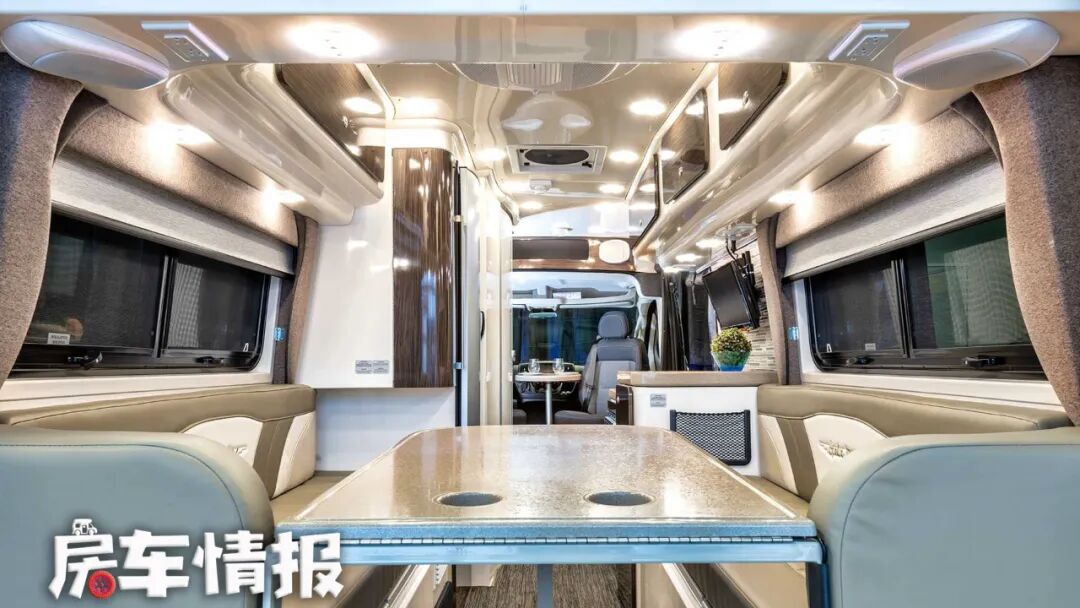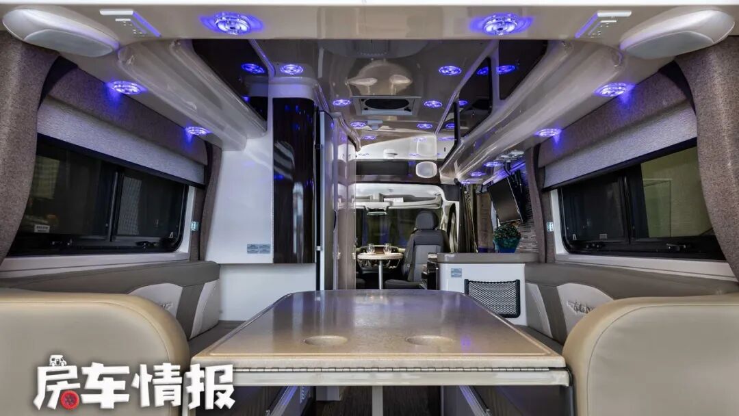 进入车厢内部,可以看到整车空间还是比较宽敞充裕的,再加上出色的做工,营造出了不错的豪华氛围!车厢内部被划分为三个区域,分别为可旋转驾驶座椅的会客区、中部厨卫区、尾部主休息区,各个区域间划分清晰,日常使用比较便利。车厢后方的沙发休息区,搭配一张大尺寸餐桌,能够完全满足一家人在此吃饭休息或者社交聊天,在一侧的墙上还配备有小型电视。沙发的靠背和坐垫填充比较厚实,日常乘坐舒适性相当不错,完全可以和家里的沙发媲美。顶部还装有顶灯,黄色和紫色氛围灯带,营造出了更加温馨的氛围。