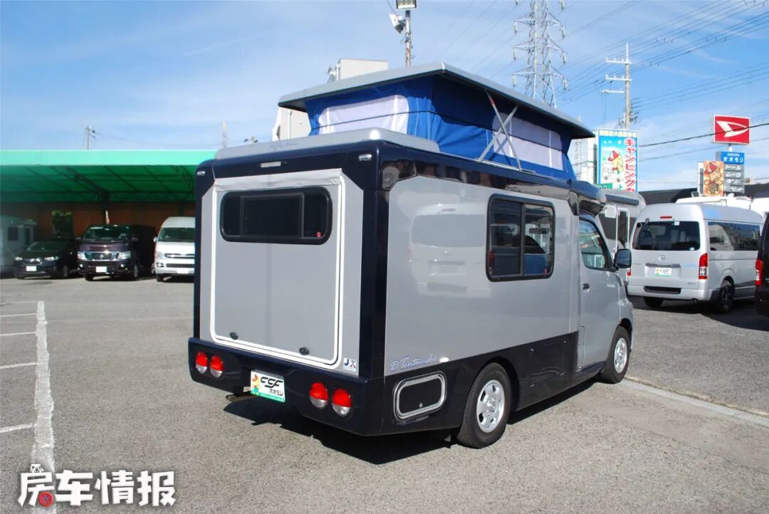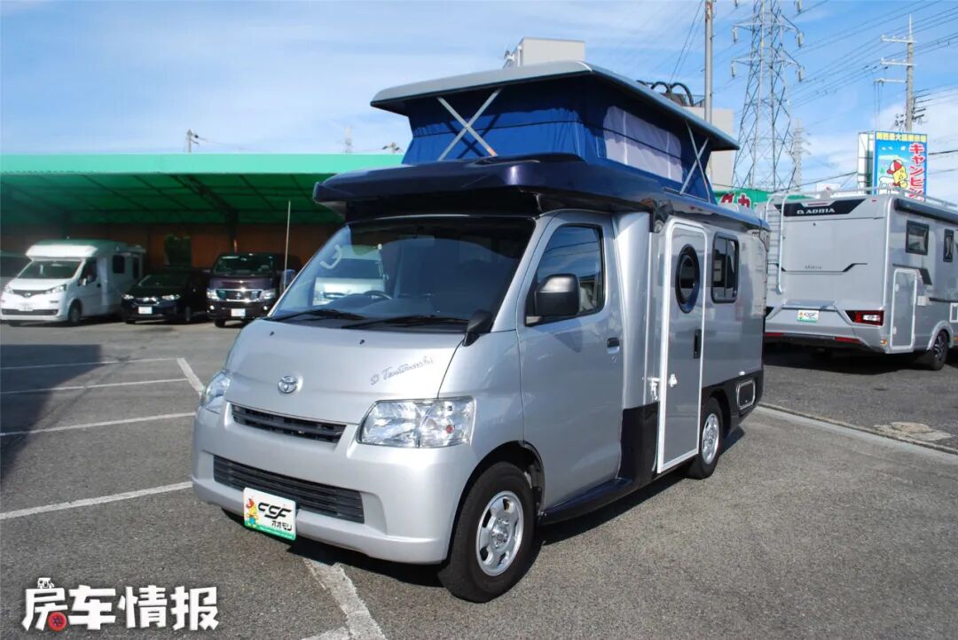 从外形上看,这款车显然是采用的丰田轻卡底盘进行的改装,不过个头不大,4550*1770*2090mm,有点类似国内的面包车。房车一共有四道门,分别是主、副驾驶门、中置乘客门和车尾门,进出车内都比较方便。车顶设计成了弹出式,配合车顶帐篷,就可以当成二层“卧室”空间。