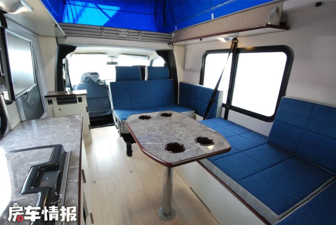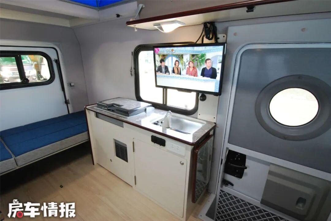 本房车的生活区分为会客区+休息区+厨卫区,会客区在房车的中部位置,由一个双人沙发+L型卡座+升降茶桌组成。桌面四角处留有杯托,在房车行驶过程中也可以办公、聚会等,桌子对面就是厨房区域,就餐时很方便。L沙发对面,安装了一台可旋转的液晶电视机,连上WIFI网络就可以尽情观影了。