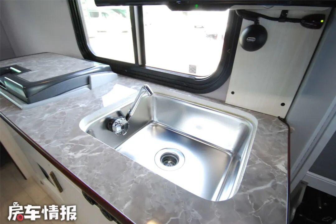 房车旅行,短不了生火、露营,厨房设备是必不可少的。这款房车的厨房沿用了经典的长方形灶台,上面做成了耐高温的大理石饰面,还带可以折叠的延长小桌板,比较实用。灶台上内嵌了不锈钢水槽+折叠水龙头,不用时水龙头可隐藏在水槽里,盖上砧板,灶台就变成了狭长的操作台了。水槽旁边设计了一个嵌入式的房车专用冰箱,采用上掀门设计,即节约空间,又不失美观,这种将冰箱整体藏在灶台底下的设计,不知道会不会有一天在国产房车中发现?