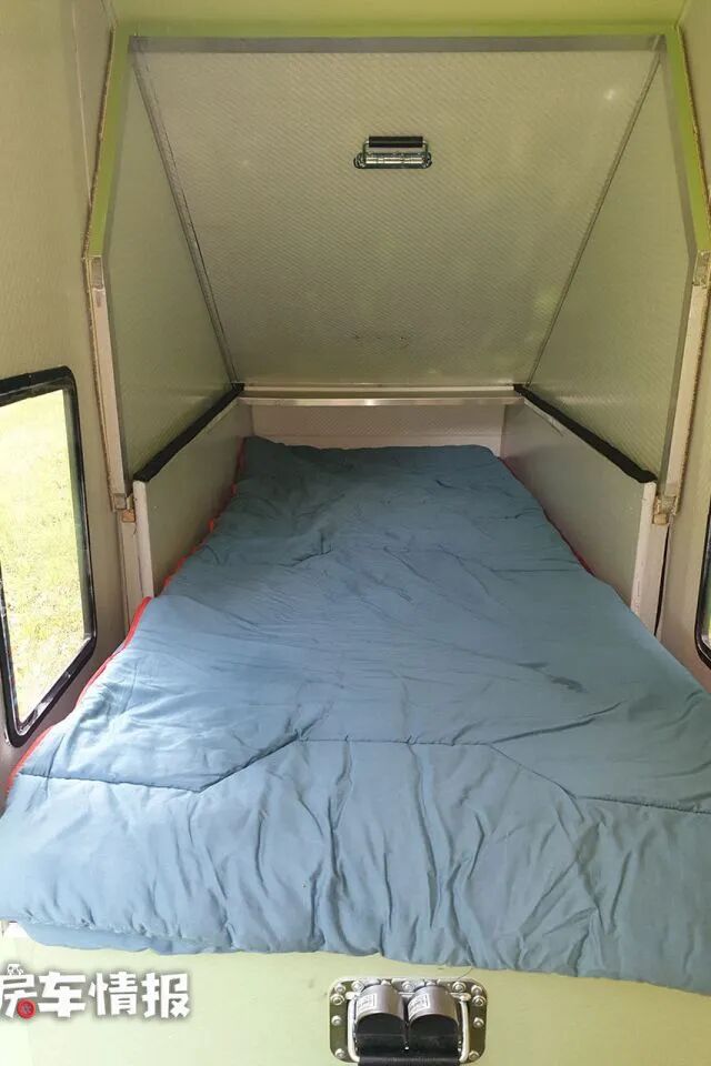 至于车内的休息区域,就比较简单,由于车身的尺寸并不是很大,内部的空间也受到了限制,如果想像在其它房车里那样自由活动是不太可能了,但内部依然可以呈现出一张尺寸达到了1900*900mm的单人床,一个人在里边休息是完全没有问题的,可以说这是一款标准的“单人房车”。