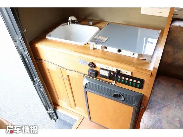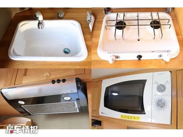 车厢尾部左右两侧分别是卫生间和厨房区域,厨房区域提供了燃气灶、冰箱、抽油烟机、洗菜池等,这里的配备比起传统日本房车要更加全面。