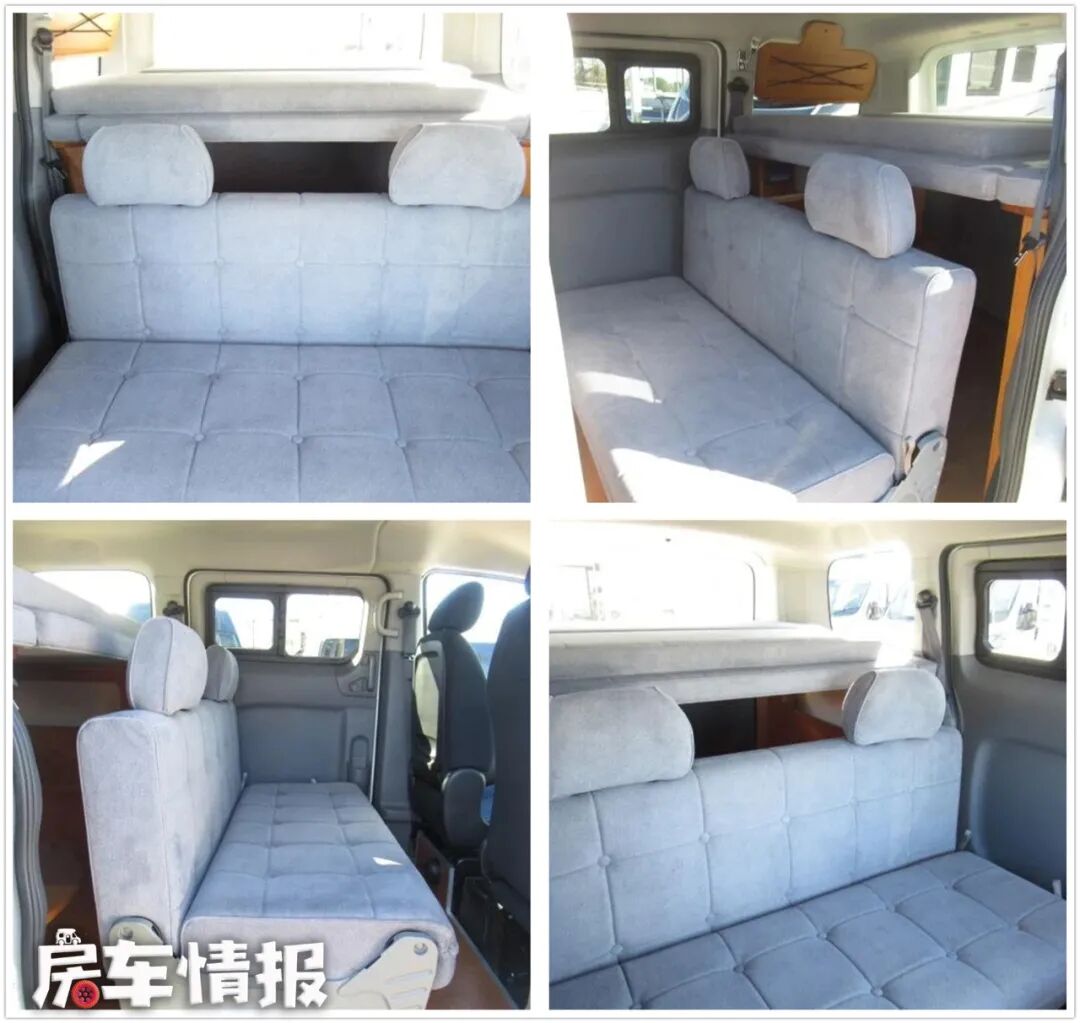 双人沙发卡座,取代了常见的驾驶座椅,提升了不少舒适度。四季布艺材料的运用,也有利于环保,更重要的,拼成大床之后,就可以直接躺下而不用布置充气床垫,沙发自身的柔软度便能够满足乘坐和睡卧舒适性。