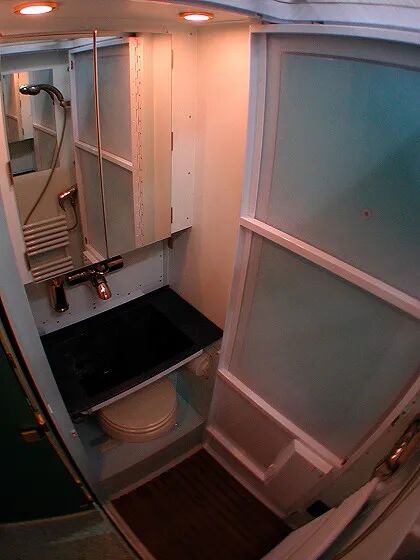 车厢前方是卫生间所在的区域,内部空间表现尚可,采用干湿分离设计,提供了马桶、淋浴、置物架等常用设施,搭配车上的400L净水箱和22L热水器以及100L灰水箱。在电力系统方面,这款车采用24V电路系统,配备了4000W逆变器、420Ah锂电池以及一台4KW柴油发电机,同时还有2个11KG的液化气罐,足够日常使用。