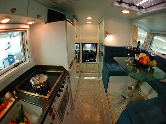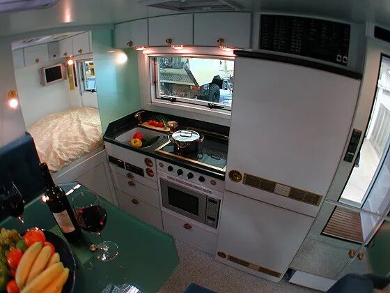 与沙发区域对立的是车内的厨房区域,提供了燃气灶、烤箱、冰箱、微波炉等基础设备,能够在车内制作一顿丰盛的美食。